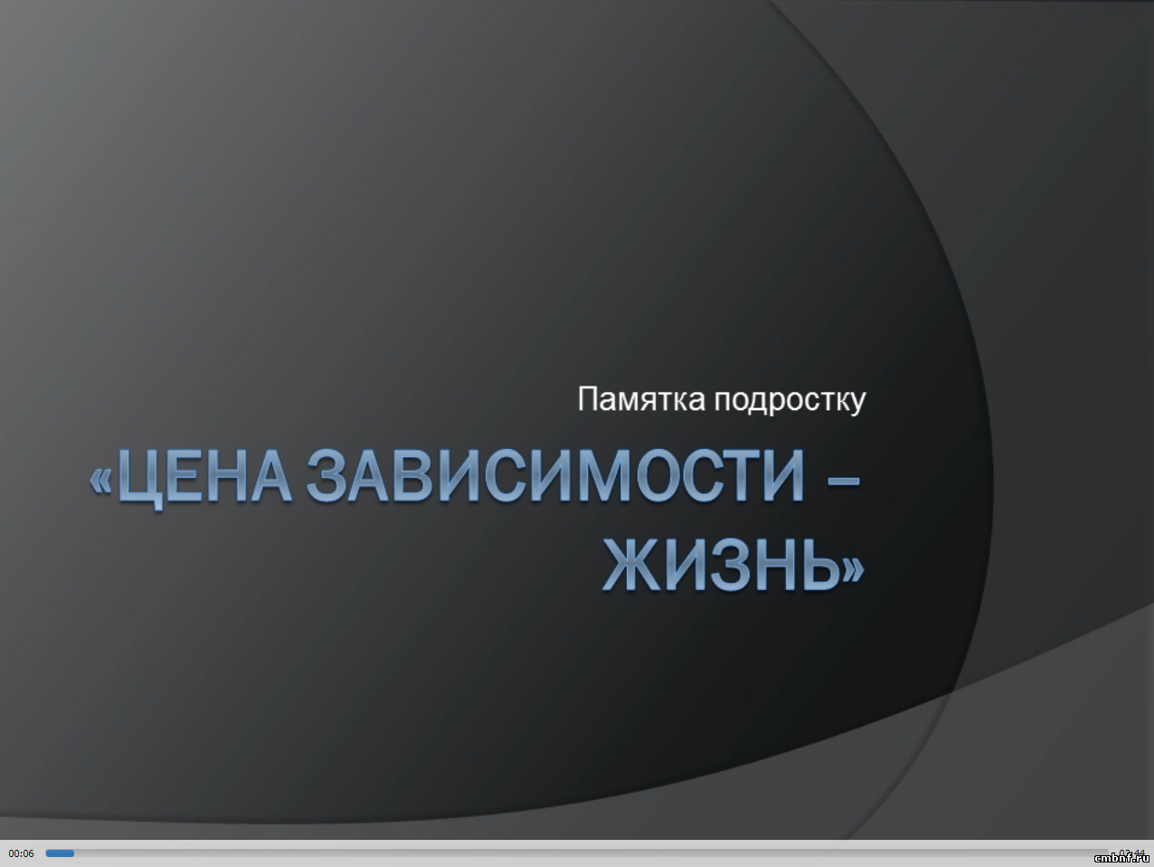 Цена зависимости – жизньОколо 250 миллионов человек во всём мире принимают запрещённые препараты. По оценкам Федеральной службы по контролю за оборотом наркотиков, в России порядка 8,8 миллиона людей принимают наркотики, а количество официально зарегистрированных наркозависимых составляет 650 тысяч. Отдел обслуживания читателей МБУК «ЦБ» (ул. Латышская, 15б) предлагает учащимся средних и старших классов ознакомиться с видеопамяткой «Цена зависимости – жизнь». Вооружившись этой информацией, читатель сможет принять решение жить без наркотиков.