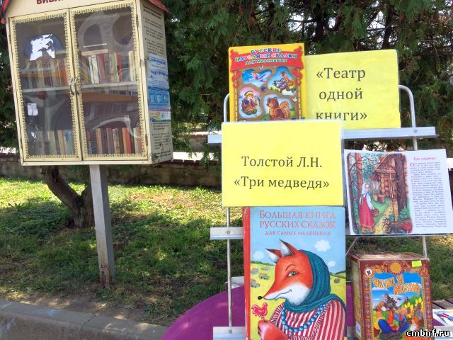 Театр одной книгиСотрудники отдела обслуживания читателей Центральной библиотеки (ул. Маршала Жукова,10) в рамках проекта «Читающий город» организовали на площади Молодёжная библиотечную арт-скамейку «Театр одной книги» .16 июля все желающие стали участниками экспромт-театра по сказке Льва Толстого «Три медведя». Каждый сумел реализовать свои актёрские способности, выбрав роль одного из героев сказки. Библиотечная арт-скамейка стала увлекательным стимулом для творческого самовыражения детей.