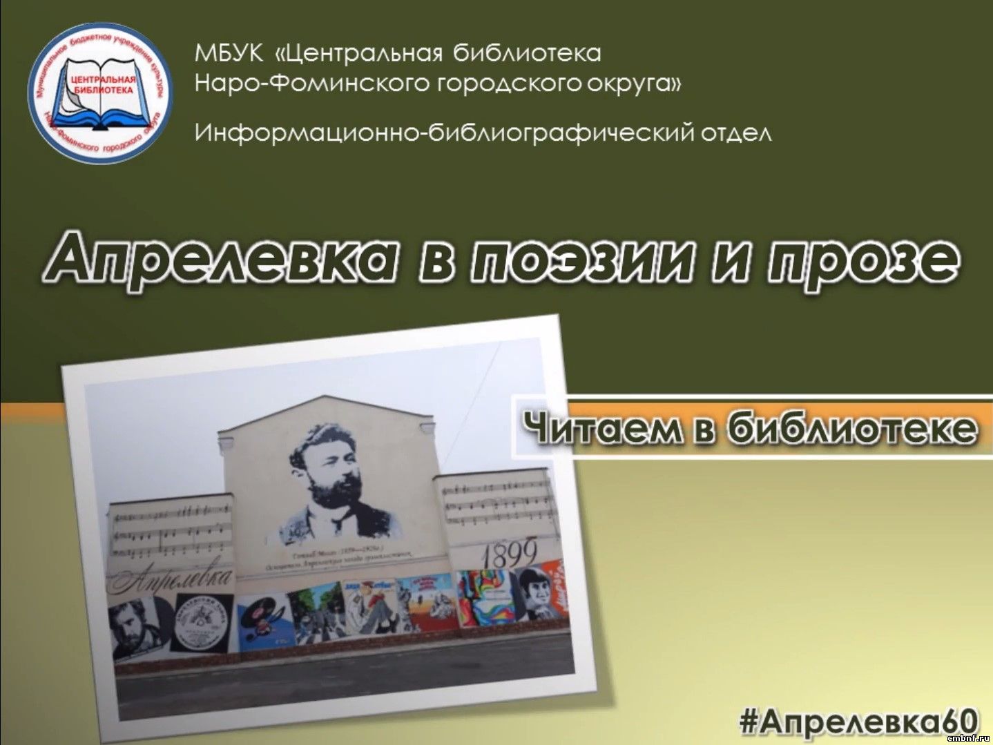 Апрелевка в поэзии и прозеК 60-летию города Апрелевки Центральная библиотека предлагает видеообзор «Апрелевка в поэзии и прозе». Апрелевка не избалована изданиями как древняя Верея или центр округа – Наро-Фоминск. Поэтому особенную ценность представляют каждое упоминание, каждое исследование или поэтическое произведение, посвящённое городу. Почти все они есть в краеведческом фонде Центральной библиотеки, переданные администрацией, подаренные авторами или преподнесённые нашими преданными читателями. Сотрудники информационно-библиографического отдела предлагают познакомиться со стихами апрелевских авторов об их родном городе, с автобиографическими произведениями известных людей, чьи судьбы непосредственно связаны с Апрелевкой, а также с общими изданиями о наро-фоминской земле, рассказывающими и об истории самого молодого города Наро-Фоминского городского округа – Апрелевки. 31 июля в Апрелевке пройдут праздничные мероприятия, посвящённые 60-летию города.