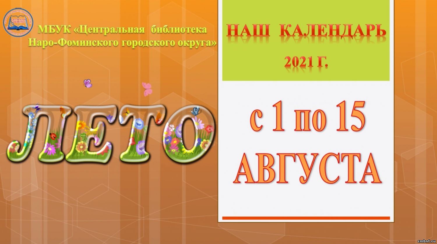 НАШ КАЛЕНДАРЬ с 1 по 15 августаПредставляем вашему вниманию «Наш календарь» знаменательных и памятных дат с 1 по 15 августа, подготовленный Лукьяновой И.А. - библиографом информационно-библиографического отдела.