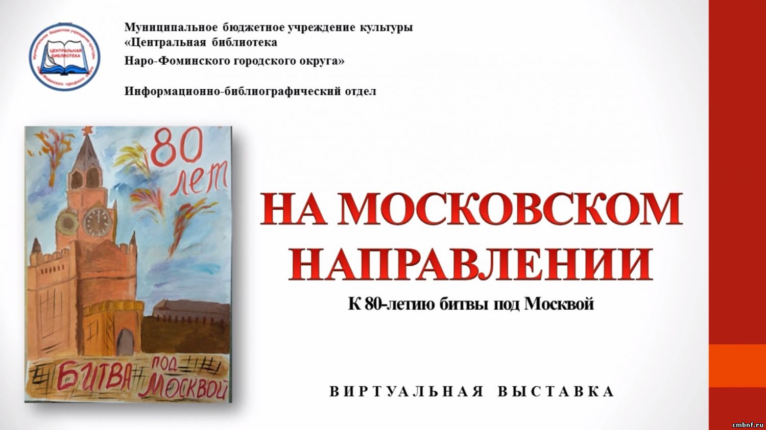 НА МОСКОВСКОМ НАПРАВЛЕНИИОдним из крупнейших сражений в истории Великой Отечественной войны стала битва за Москву. Красная армия не только выстояла в обороне осенью 1941 года, но и в декабре перешла в контрнаступление. Именно здесь, на подступах к столице, хвалёная гитлеровская армия потерпела первое серьёзное поражение. К 80-летию Московской битвы библиографом информационно-библиографического отдела Центральной библиотеки Лукьяновой И.А. подготовлена для юных читателей виртуальная выставка «НА МОСКОВСКОМ НАПРАВЛЕНИИ». Вниманию детей и подростков представлены книги, основу которых составляет историко-художественное повествование о героическом подвиге защитников Москвы. Вечная им слава и память! Познакомиться с виртуальной выставкой можно на сайте Центральной библиотеки в разделе «Книжная полка».
