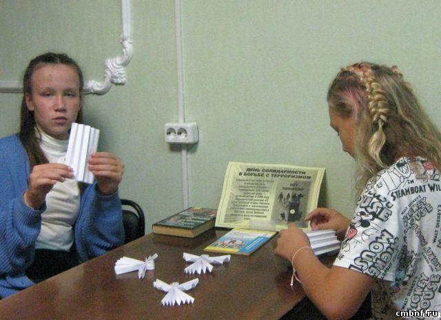Помнить, чтобы жизнь продолжаласьВ День солидарности в борьбе с терроризмом в библиотеке в д.Веселево прошел час памяти «Помнить, чтобы жизнь продолжалась. Трагедия Беслана». Дети узнали о хронике событий, о жестокости и бесчеловечности террористов, об отваге и мужестве спецназа, учителей и воспитателей. Ребята внимательно слушали и отвечали на вопросы: кто такие террористы и откуда они взялись. Участникам мероприятия было рассказано и о других террористических актах, которые произошли в нашей стране и за ее пределами. Затем ребята изготовили бумажных ангелочков, в память о тех, чье детство и жизнь оборвались в самый радостный школьный день – детей Беслана.