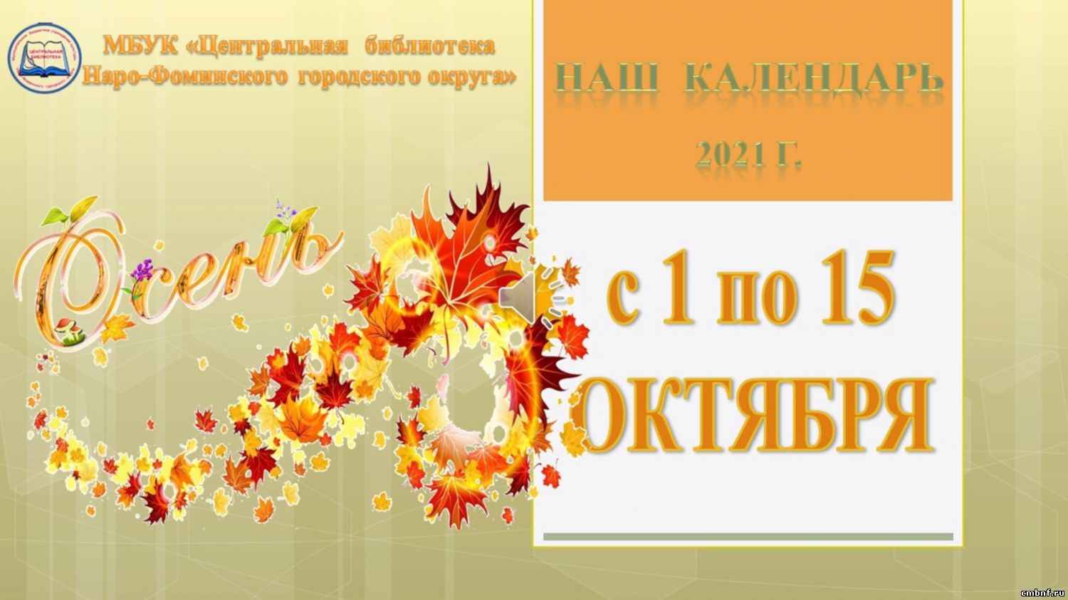 Наш календарь знаменательных и памятных дат с 1 по 15 октябряПредставляем вашему вниманию «Наш календарь» знаменательных и памятных дат с 1 по 15 октября, подготовленный Лукьяновой И.А. - библиографом информационно-библиографического отдела.