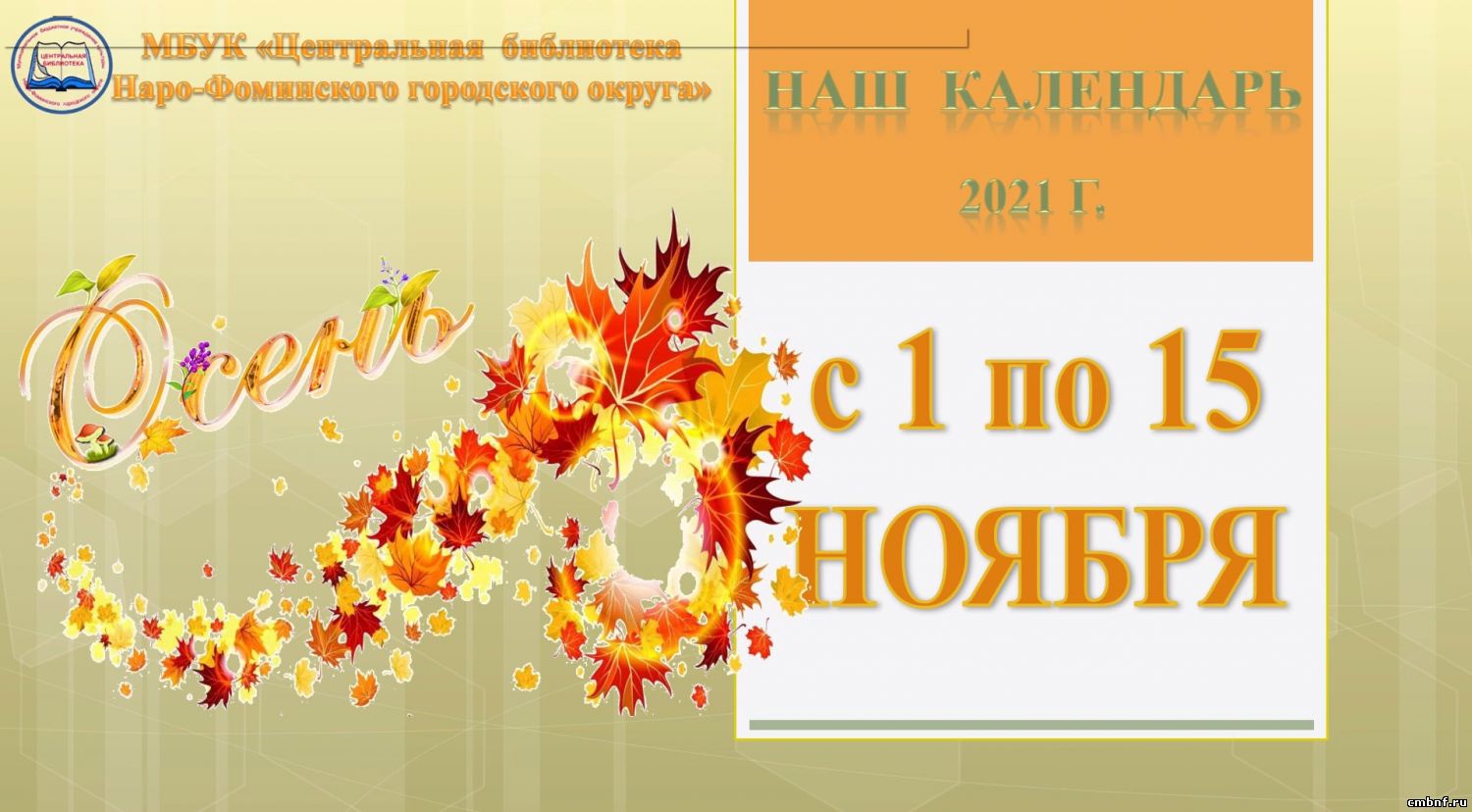 Наш календарь с 1 по 15 ноябряПредставляем вашему вниманию «Наш календарь» знаменательных и памятных дат с 1 по 15 ноября, подготовленный Лукьяновой И.А. - библиографом информационно-библиографического отдела.