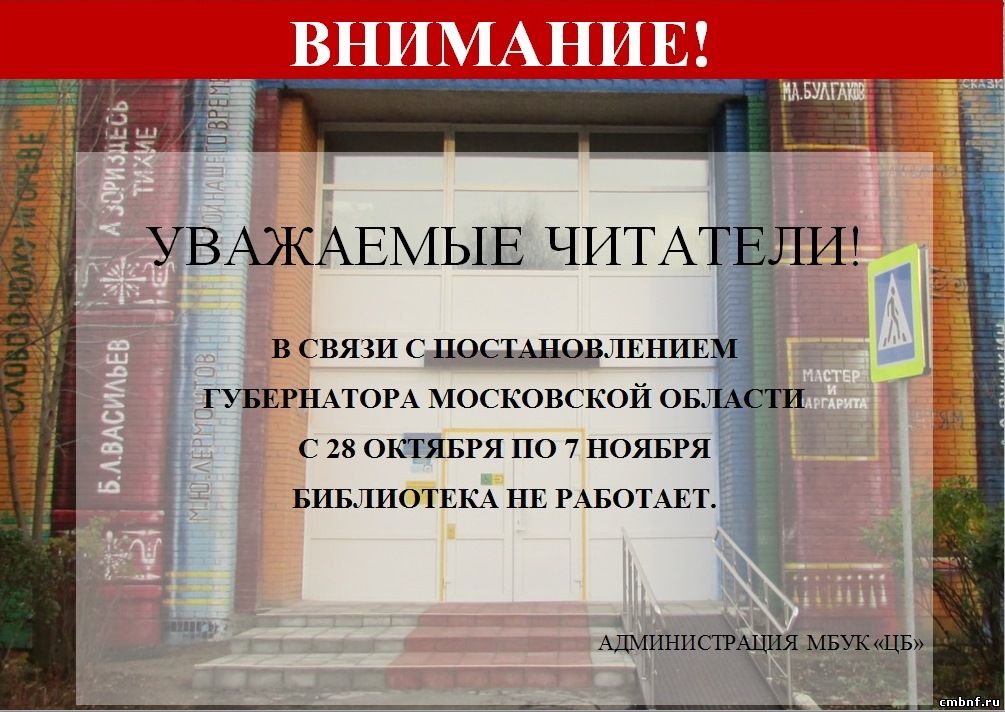УВАЖАЕМЫЕ ЧИТАТЕЛИ!В СВЯЗИ С ПОСТАНОВЛЕНИЕМ ГУБЕРНАТОРА МОСКОВСКОЙ ОБЛАСТИ С 28 ОКТЯБРЯ ПО 7 НОЯБРЯ БИБЛИОТЕКА НЕ РАБОТАЕТ. Желаем всем здоровья! Берегите себя и близких!