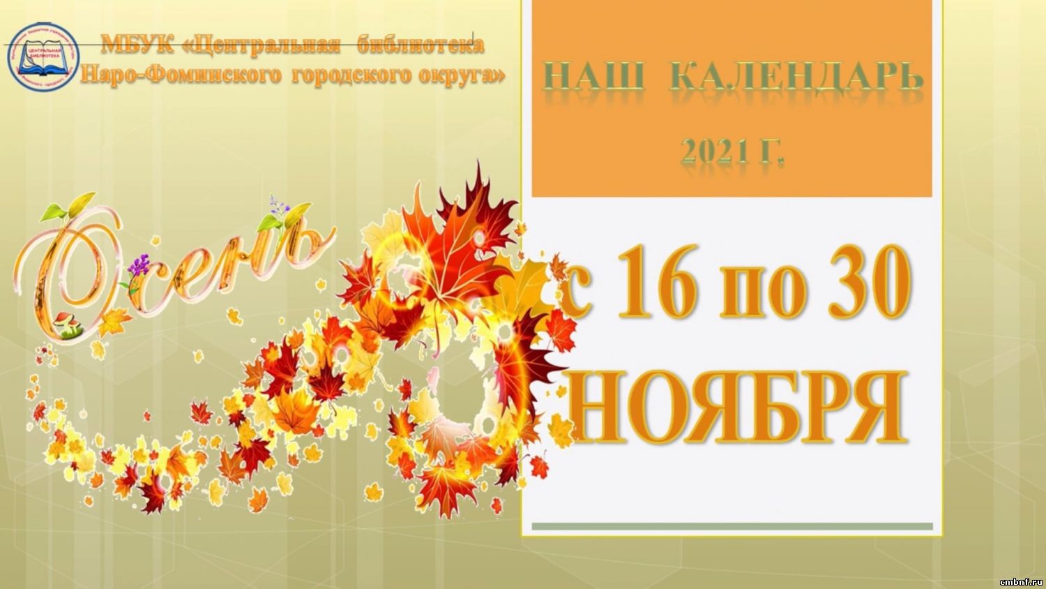 «Наш календарь» знаменательных и памятных дат с 16 по 30 ноябряПредставляем вашему вниманию «Наш календарь» знаменательных и памятных дат с 16 по 30 ноября, подготовленный Лукьяновой И.А. - библиографом информационно-библиографического отдела.
