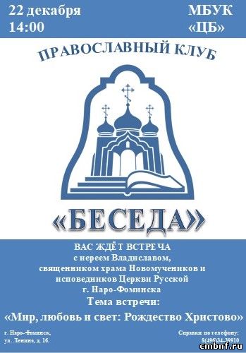 Клуб «Беседа» приглашает«Мир, любовь и свет: Рождество Христово» – под таким названием 22 декабря в Центральной библиотеке состоится очередная встреча участников православного клуба «Беседа» со священником храма Новомучеников и исповедников Церкви Русской города Наро-Фоминска иереем Владиславом, который проведёт беседу, ответит на вопросы. После мероприятия у каждого будет возможность задать личный вопрос священнослужителю и побеседовать индивидуально. Ждём вас 22 декабря в 14.00 по адресу: г. Наро-Фоминск, ул. Ленина, д. 16.