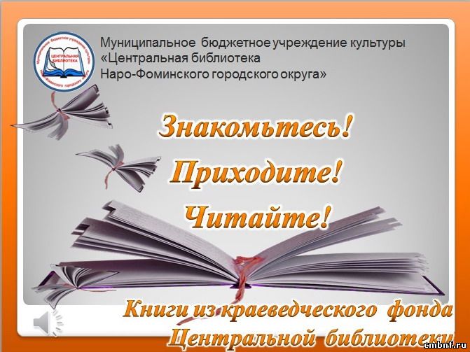 «Знакомьтесь! Приходите! Читайте!»Новые книги в краеведческом фонде информационно-библиографического отдела Центральной библиотеки В Центральной библиотеке Наро-Фоминского городского округа стало доброй традицией в январе каждого года знакомить читателей с книгами, поступившими в краеведческий фонд за прошедший год. Новинки последних лет или вышедшие уже давно, но желанные и долгожданные, эти книги пополняют и обогащают наши знания об истории и культуре родного края и всегда пользуются повышенным спросом. Предлагаем вашему вниманию виртуальную выставку «Знакомьтесь! Приходите! Читайте!». Знакомьтесь с новыми книгами о военной истории наро-фоминской земли, а также с произведениями наших земляков – писателей и поэтов. Приходите в библиотеку и читайте!