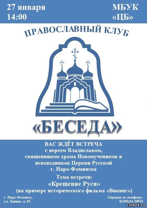 Клуб «Беседа» приглашаетФильм Андрея Кравчука «Викинг» стал в своё время не только самым кассовым в российском прокате, но и самым обсуждаемым. Он затронул одну из важных тем – Крещение Руси. Обсудить фильм, его достоверность и точность, смогут читатели Центральной библиотеки на очередном заседание участников православного клуба «Беседа». На встречу приглашён иерей Владислав, священник храма Новомучеников и исповедников Церкви Русской города Наро-Фоминска. Священник выскажет своё мнение о фильме, ответит на вопросы. Участников клуба ждёт тематическая викторина. После мероприятия у каждого будет возможность задать личный вопрос священнослужителю и побеседовать индивидуально. Ждём Вас в Центральной библиотеке 27 января в 14.00. по адресу: г. Наро-Фоминск, ул. Ленина, д.16.