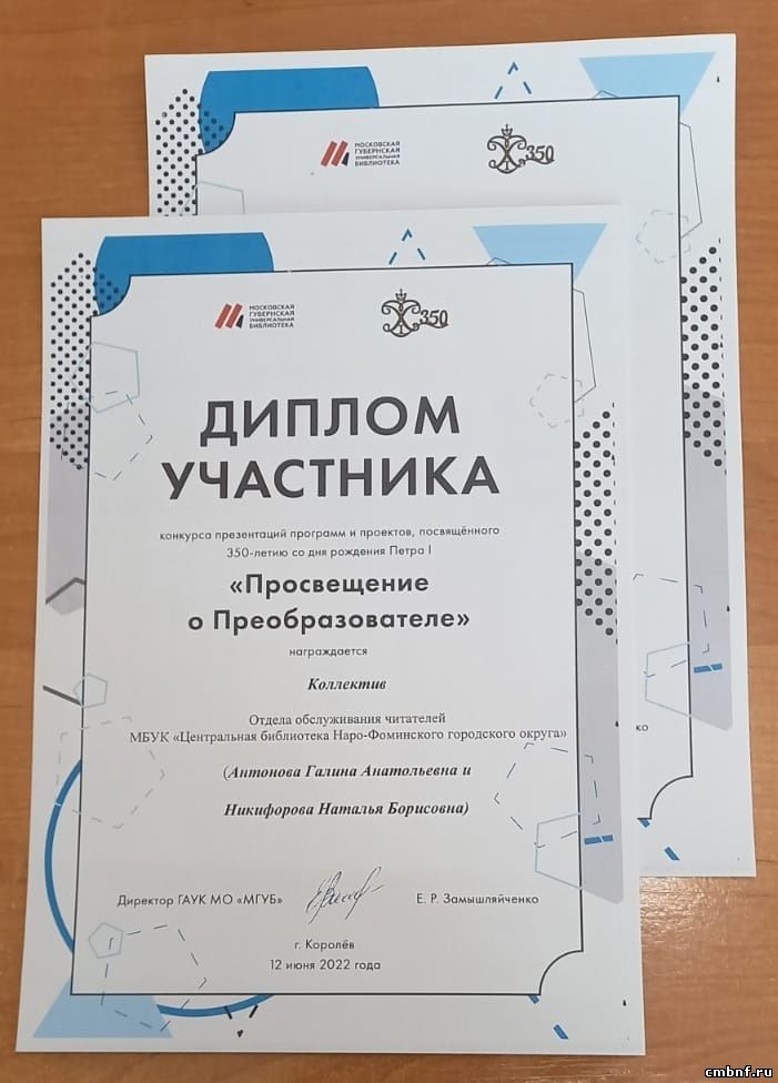 Просвещение о ПреобразователеВ июне 2022 года в России отметили 350-летие со дня рождения императора Петра I. Московская губернская универсальная библиотека провела конкурс презентаций программ и проектов «Просвещение о Преобразователе», посвященный этой памятной дате. В конкурсе приняли участие сотрудники отдела обслуживания читателей Центральной библиотеки (ул. Латышская, 15б) Г.А. Антонова и Н.Б. Никифорова и библиотекарь сельского отдела обслуживания читателей в п.Васильчиново О.А. Овчинникова. За свои проекты о великом русском самодержце наши библиотекари получили памятные Дипломы.