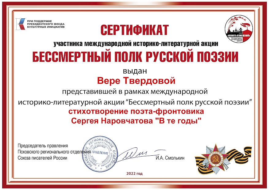 Бессмертный полк русской поэзииС 3 мая по 30 августа в Московской области прошла международная историко-литературная акция «Бессмертный полк русской поэзии» в рамках литературного проекта «Память поколений», получившего поддержку Президентского фонда культурных инициатив. Акция призвана вернуть читателям и пользователям интернета имена поэтов-фронтовиков и поэтов-блокадников, их живое поэтическое свидетельство о Великой Отечественной войне. Видеоканал «Бессмертный полк русской поэзии» и размещенные на нём видеоролики со стихами о войне стали литературным онлайн-памятником воинам-победителям, защитившим мир от фашизма. Читатели библиотек Наро-Фоминского городского округа принимают активное участие в акции. Представляем видеоролик Веры Твердовой (п.Васильчиново) со стихотворением поэта-фронтовика Сергея Наровчатова «В те годы».