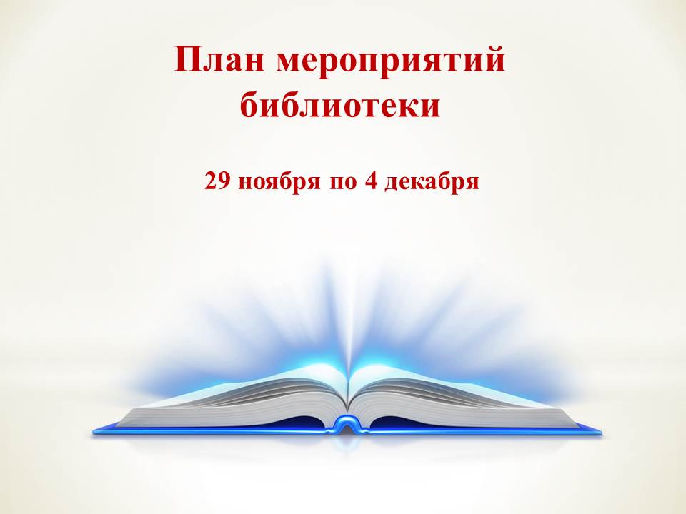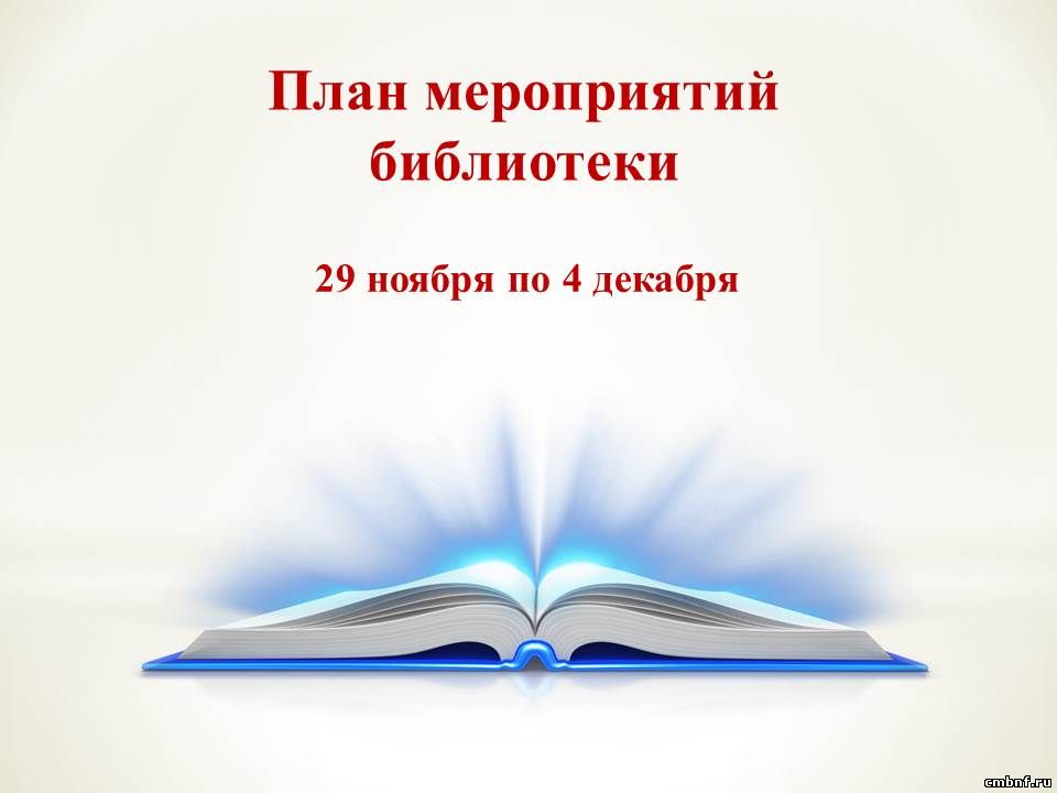 План мероприятий с 29 ноября по 4 декабряПредлагаем ознакомиться с мероприятиями на текущую неделю, которые пройдут в отделе обслуживания читателей по адресу ул.Латышская, д.15б