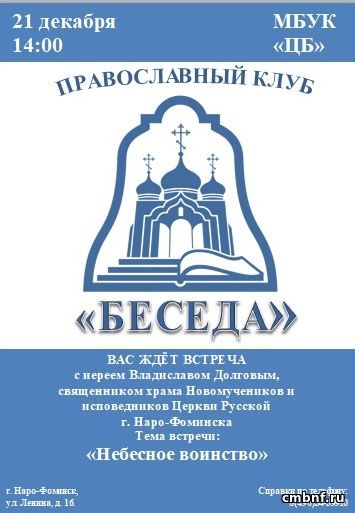 Небесное воинствоПриглашаем всех желающих на очередную встречу православного клуба «Беседа» и предлагаем поговорить о Соборе Архангела Михаила и прочих Небесных сил бесплотных. В беседе примет участие и ответит на вопросы иерей Владислав Долгов, священник храма Новомучеников и исповедников Церкви Русской города Наро-Фоминска. После мероприятия у каждого будет возможность задать личный вопрос священнослужителю и побеседовать индивидуально. Встреча пройдёт в Центральной библиотеке 21 декабря в 14-00 по адресу: г. Наро-Фоминск, ул. Ленина, дом 16.