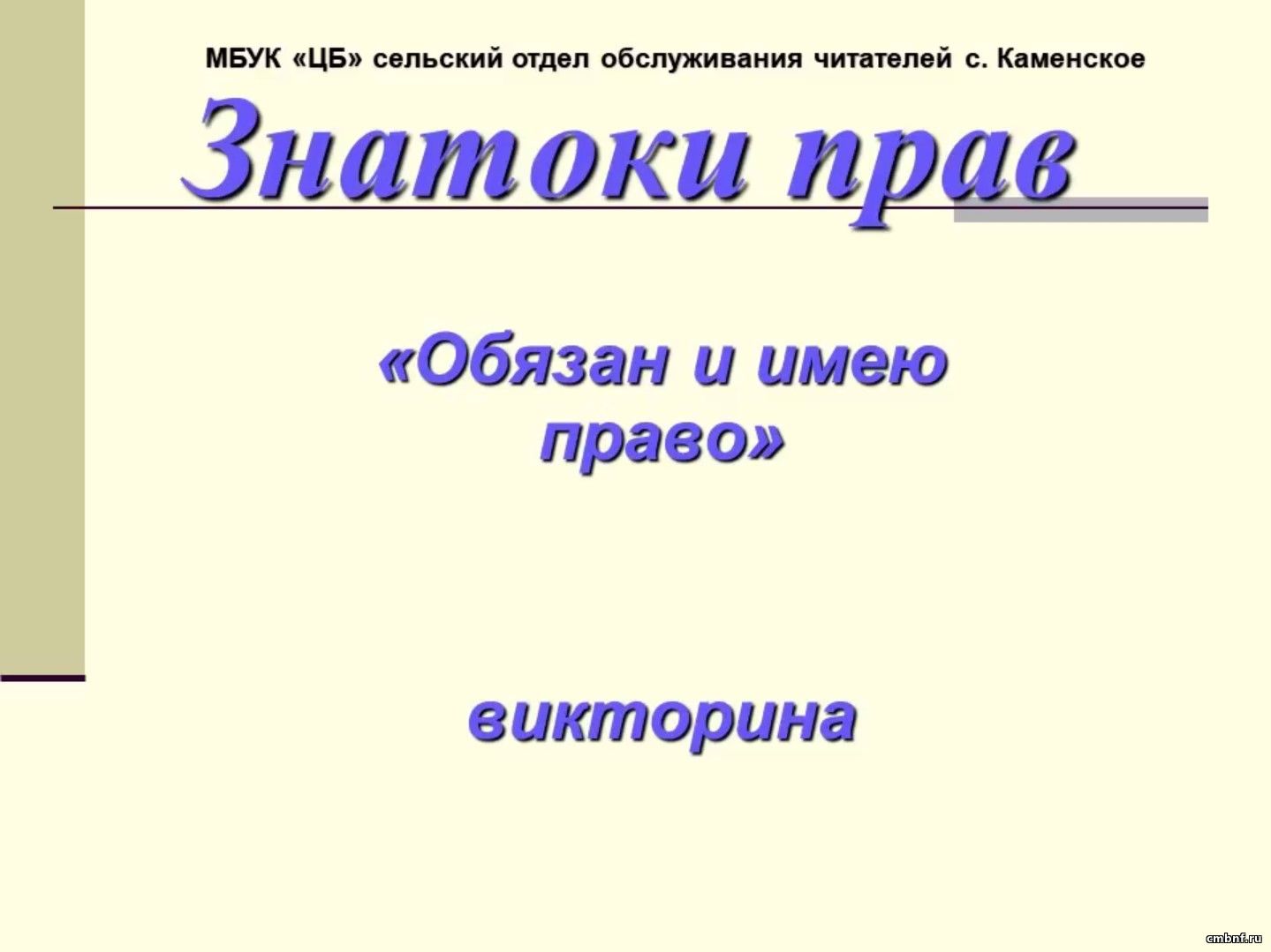Обязан и имею правоБиблиотекарь сельского отдела обслуживания читателей с. Каменское Вера Семакина представляет онлайн-викторину «Обязан и имею право».