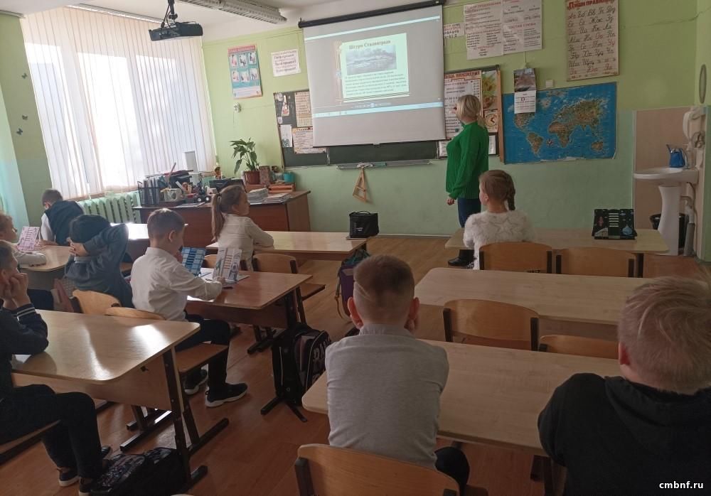 Это нашей истории строки2 февраля в сельском отделе обслуживания читателей д. Волченки, библиотекарь Анастасия Тихонова провела урок памяти «Это нашей истории строки», посвящённый Сталинградской битве. Ребята познакомились с героями, защищавшими город, узнали о важных датах при обороне Сталинграда.