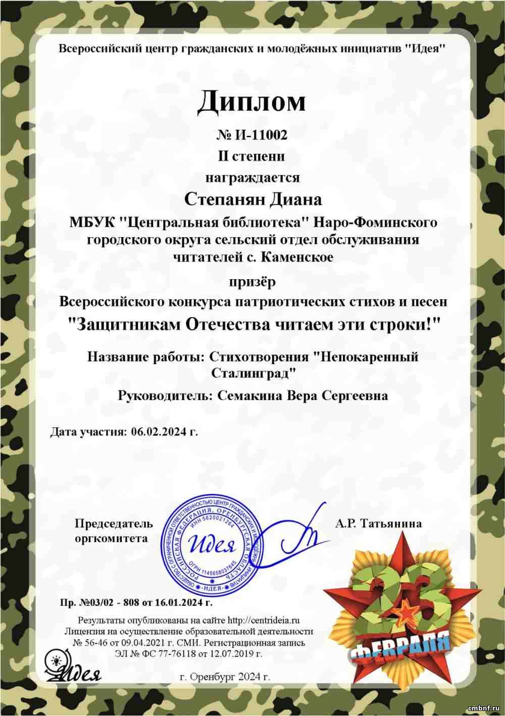 Всероссийский конкурс «Защитникам Отечества читаем эти строки!»Центром гражданских и молодёжных инициатив «Идея» г. Оренбурга 6 февраля 2024 проводился Всероссийский конкурс патриотических стихов и песен «Защитникам Отечества читаем эти строки!». В нем приняли участие читатели МБУК «Центральная библиотека» Наро-Фоминского округа сельский отдел обслуживания с. Каменское под руководством библиотекаря Семакиной Веры Сергеевны. Призером конкурса стала Степанян Диана, получившая Диплом II степени. Оргкомитет Центра гражданских инициатив «Идея» вручил Благодарственное письмо Семакиной Вере Сергеевне за организацию участия и подготовку читателей библиотеки во Всероссийском конкурсе.