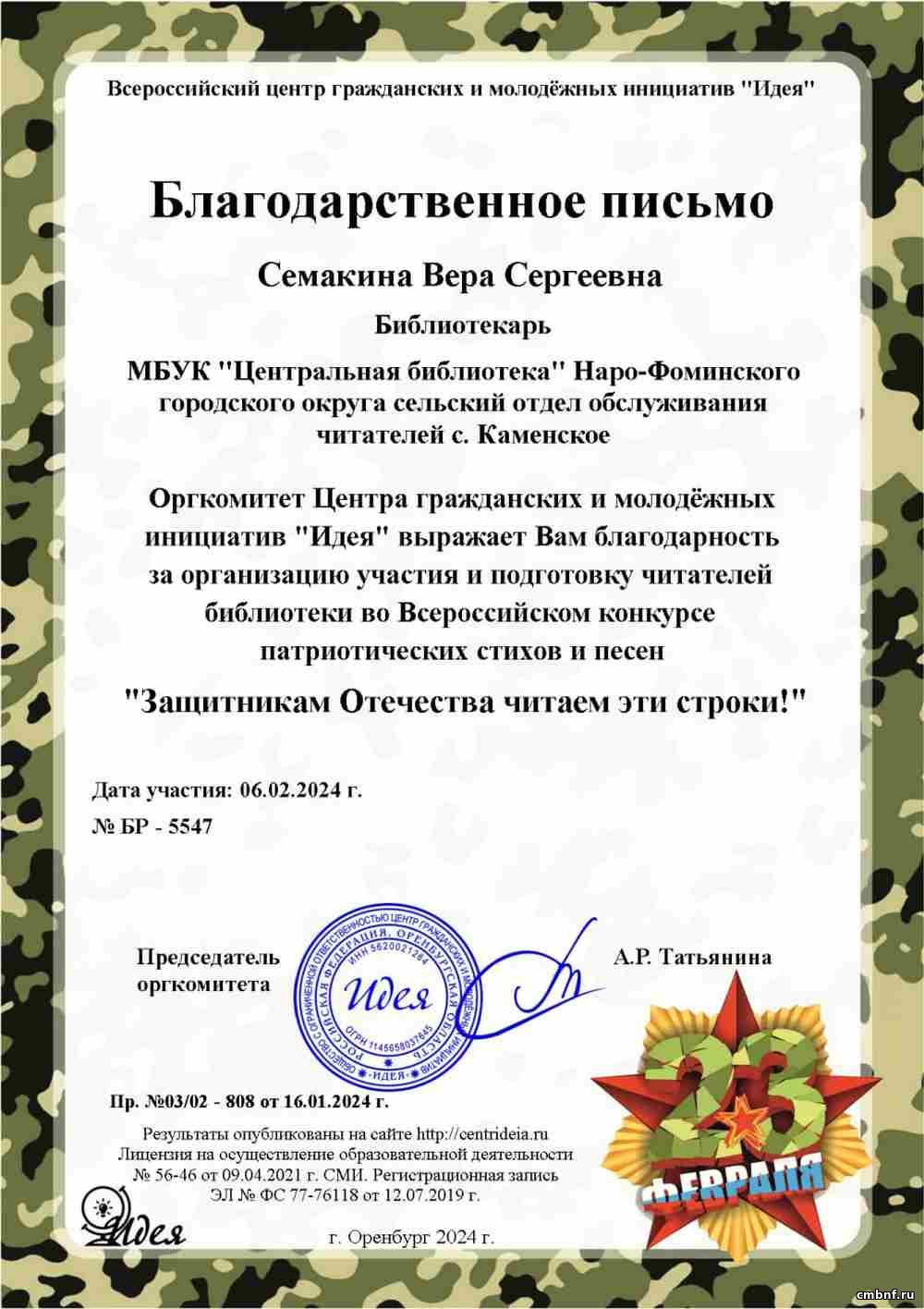 Центром гражданских и молодёжных инициатив «Идея» г. Оренбурга 6 февраля 2024 проводился Всероссийский конкурс патриотических стихов и песен «Защитникам Отечества читаем эти строки!». В нем приняли участие читатели МБУК «Центральная библиотека» Наро-Фоминского округа сельский отдел обслуживания с. Каменское под руководством библиотекаря Семакиной Веры Сергеевны.