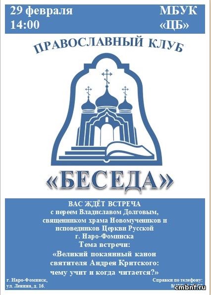 Великий покаянный канон святителя Андрея Критского: чему учит и когда читается?Приглашаем всех желающих на очередную встречу православного клуба «Беседа» и предлагаем поговорить о Великом покаянном каноне преподобного Андрея Критского. В беседе примет участие иерей Владислав Долгов, священник храма Новомучеников и исповедников Церкви Русской города Наро-Фоминска. После мероприятия у каждого будет возможность задать личный вопрос священнослужителю и побеседовать индивидуально. Встреча пройдёт в Центральной библиотеке 29 февраля в 14-00 по адресу: г. Наро-Фоминск, ул. Ленина, дом 16. Справки по телефонам: 8-496-343-99-10; 8-496-343-80-51