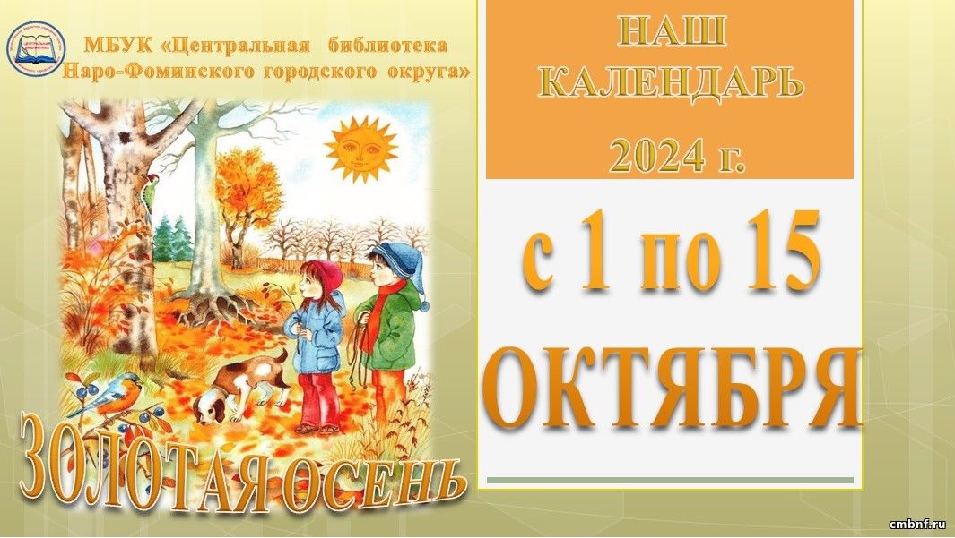 Наш календарь с 1 по 15 октябряПредставляем вашему вниманию «Наш календарь» знаменательных и памятных дат с 1 по 15 октября 2024 года, подготовленный ведущим библиографом МБУК «ЦБ Наро-Фоминского городского округа» Ириной Лукьяновой. На страницах календаря читатели познакомятся с подборкой интересной информации, посвящённой Году семьи.