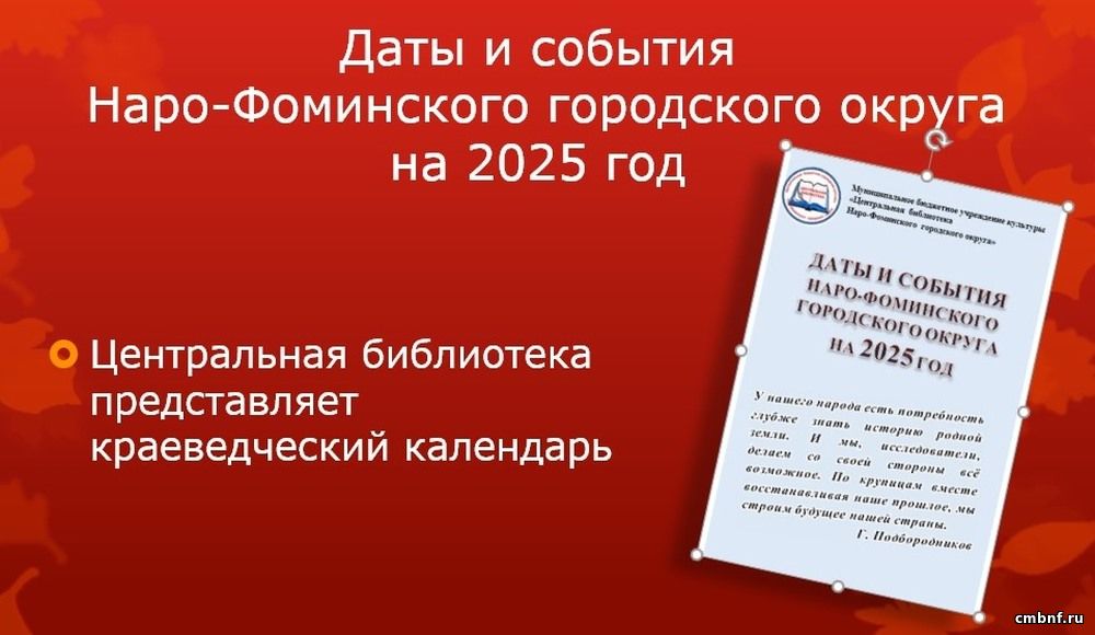 Даты и события Наро-Фоминского городского округа на 2025 годВ Центральной библиотеке много лет ведётся работа по составлению краеведческого календаря. Праздничные дни и памятные даты Московской области, значительные и интересные события из истории Наро-Фоминского городского округа, а также краткие сведения о выдающихся людях, чьи имена связаны с наро-фоминской землёй, составляют его основное содержание. В календарь включаются даты, выявленные по источникам, имеющимся в краеведческом фонде МБУК «ЦБ», на основании краеведческого каталога, который ведётся в библиотеке с ноября 1977 года. В сентябре составлен и выпущен краеведческий календарь "Даты и события Наро-Фоминского городского округа на 2025 год". Календарь используется библиотекарями при планировании мероприятий по краеведению. Он востребован у краеведов, педагогов и любителей истории, полезен всем, кого интересует прошлое и настоящее наро-фоминской земли.