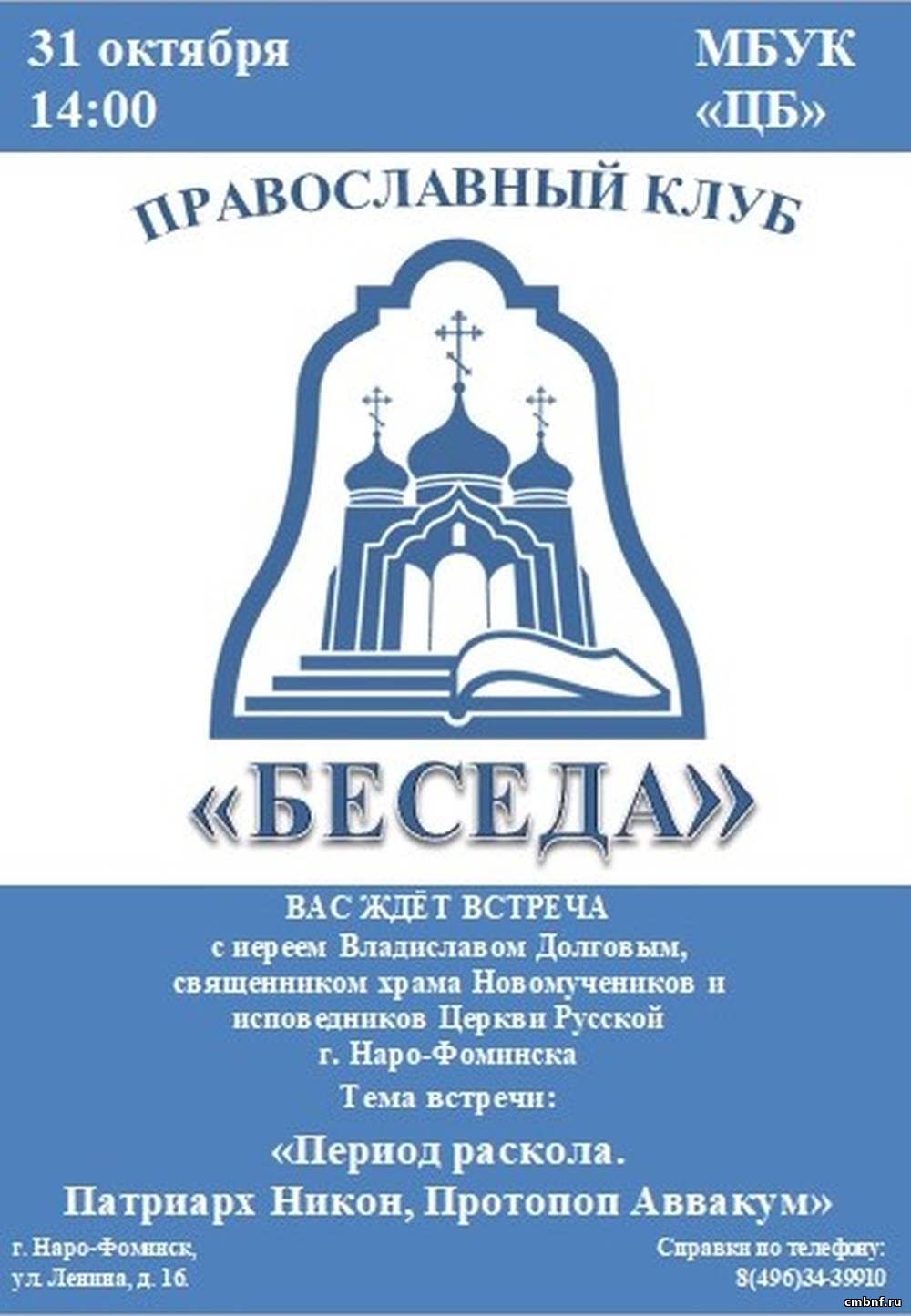 Период раскола: Патриарх Никон, протопоп АввакумПриглашаем всех желающих на очередную встречу православного клуба «Беседа» и предлагаем поговорить о Церковном расколе в XVII веке, о том, как сложилась судьба Патриарха Никона и протопопа Аввакума. В беседе примет участие и ответит на вопросы иерей Владислав Долгов, священник храма Новомучеников и исповедников Церкви Русской города Наро-Фоминска. После мероприятия у каждого будет возможность задать личный вопрос священнослужителю и побеседовать индивидуально. Встреча пройдёт в Центральной библиотеке 31 октября в 14-00 по адресу: г. Наро-Фоминск, ул. Ленина, дом 16. Справки по телефонам: 8-496-343-99-10; 8-496-343-80-51