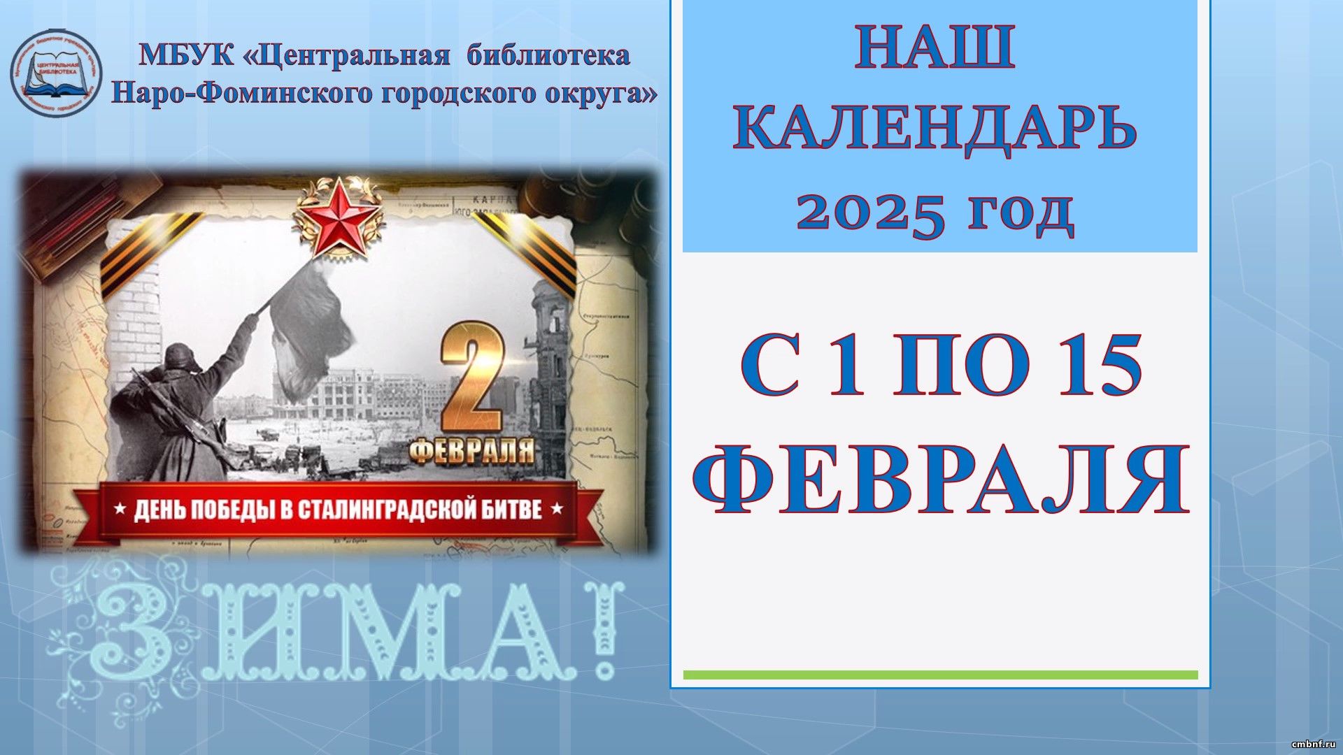 Блокадный зоосад30 января библиотекарь Анна Берёза (ул. Полубоярова, 5) побывала в гостях у подготовительной группы Наро-Фоминской средней школы № 6 дошкольного отделения № 2. Я говорю с тобой из ЛенинградаВ отделе обслуживания читателей (ул. Маршала Жукова 10) состоялось первая в этом году встреча литературного объединения «Волшебная строфа». Заседание открыл председатель объединения Козлов Г.М., поделившись новостями и достижениями Союза писателей России. Затем гости читали стихи собственного сочинения. Наш календарь с 1 по 15 февраляПредставляем вашему вниманию «Наш календарь» знаменательных и памятных дат с 16 по 31 января 2025 года, подготовленный ведущим библиографом МБУК «ЦБ Наро-Фоминского городского округа» Ириной Лукьяновой.