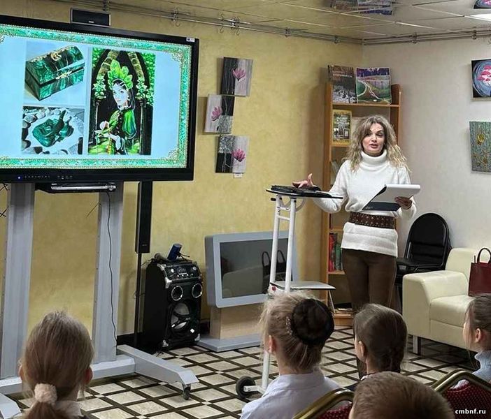 Наталья Петровна читала детям отрывки из различных сказов Бажова. В заключение встречи дети посмотрели мультфильм “Малахитовая шкатулка”, который стал прекрасным завершающим аккордом познавательного и увлекательного мероприятия.