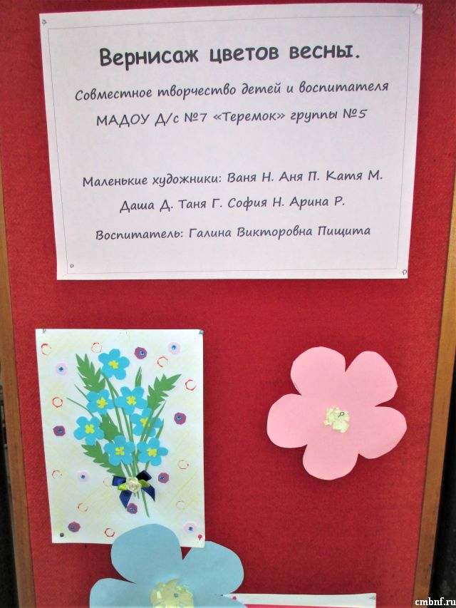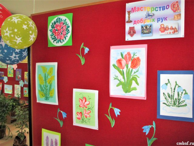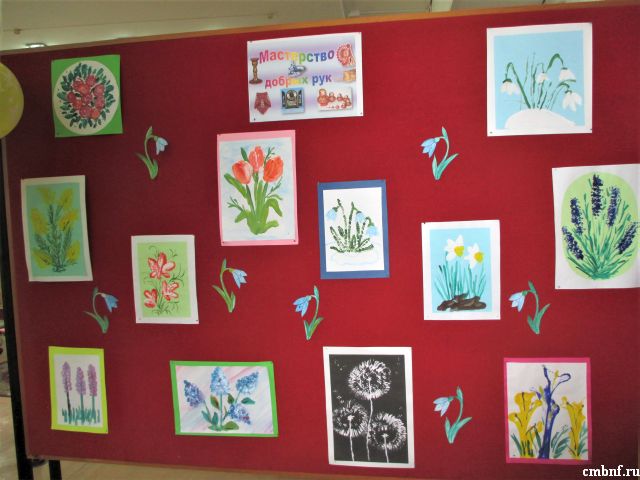 В зале досуга «Затея» для всех посетителей дарит позитивное и доброе настроение выставочный стенд с творческими работами «Вернисаж цветов весны», которые сделаны руками активных читателей на занятиях в студии «Фантазия».