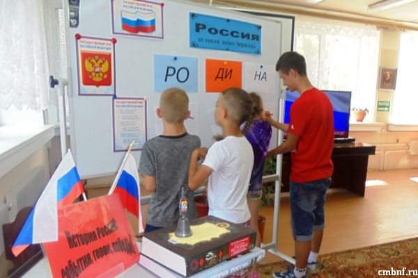 Игрой–путешествием «Откуда начинается Россия?» встретили ребят, воспитанников спортивного лагеря, библиотекари отдела обслуживания читателей Устинова С.Н. и Макеева Е.В и провели их по станциям «Флаг и герб России», « Моя Родина – Россия», «Русские загадки и сказки», «Русские песни», «Люди, которые прославили Россию». Ребятам рассказали о значении флага, герба, гимна. Провели викторины «Чьи это вещи?» и «Продолжи фразу» по мотивам русских сказок. Ребята исполнили караоке русскую народную песню «Во поле березка стояла».