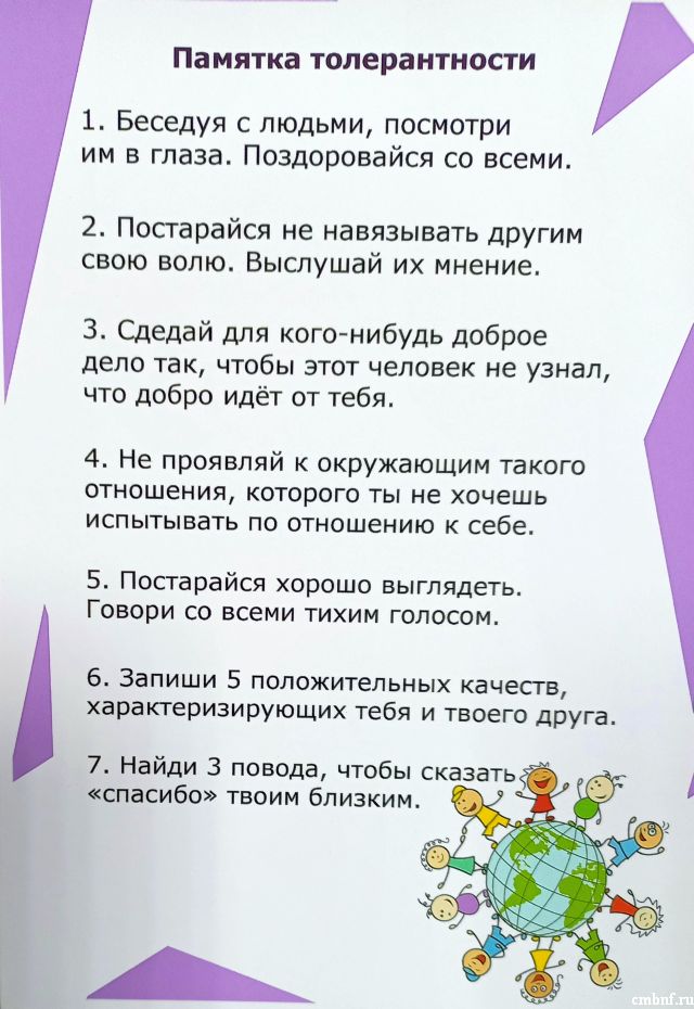 В библиотеке пос. Новая Ольховка 16 ноября прошел урок толерантности «Дружат дети – дружат народы». Библиотекарь Мария Пантелеева рассказала детям, что 16 ноября жители многих стран мира отмечают Международный день толерантности. Этот праздник был учрежден в 1995 году в результате принятия Декларации принципов терпимости государствами – членами ЮНЕСКО. Все посетившие мероприятие прослушали притчу о доброте, любви и милосердии. Узнали, что обозначает слово «толерантность» на разных языках мира, увидели символы толерантности, определили качества, которыми должен обладать толерантный человек. Также все присутствующие на мероприятии изучили и взяли с собой Памятку толерантности. И познакомились книжной выставки «Мы разные, но мы вместе».