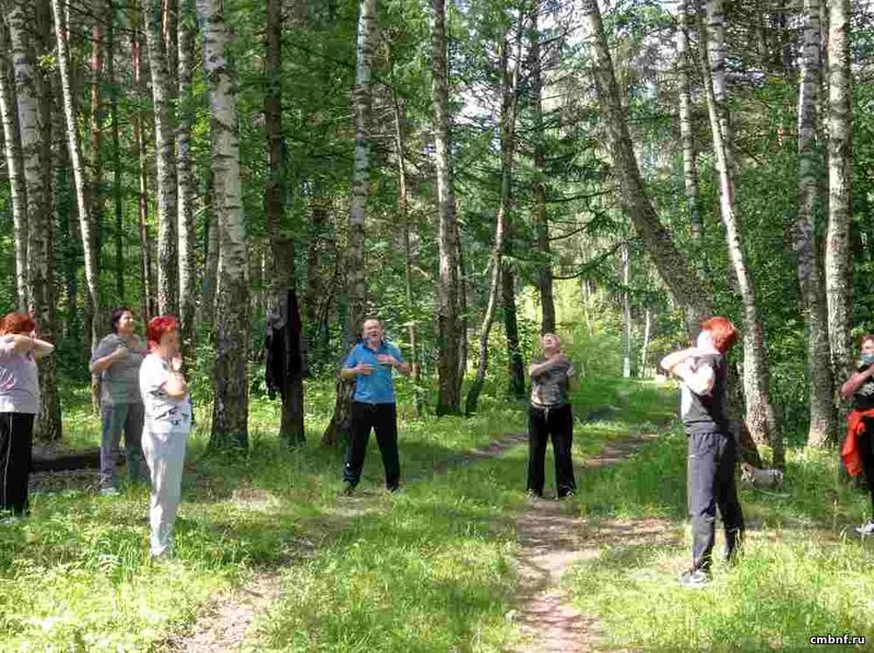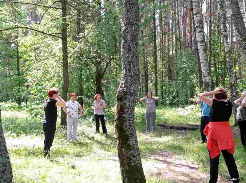 Затем в парке были выполнены разминка для суставов, дыхательная практика в ходьбе.