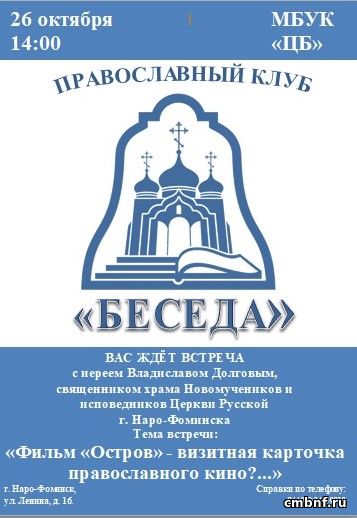 Приглашаем всех желающих на очередную встречу православного клуба «Беседа» и предлагаем обсудить тему православия в нашем кинематографе на примере фильма режиссёра Павла Лунгина «Остров» и фильма «Монах и бес» режиссёра Николая Досталя.