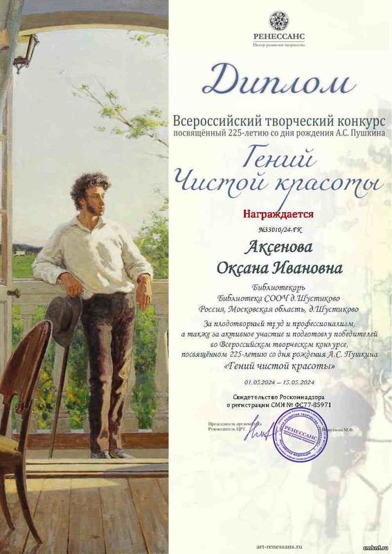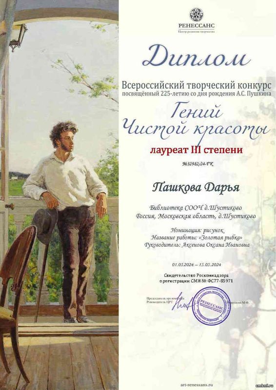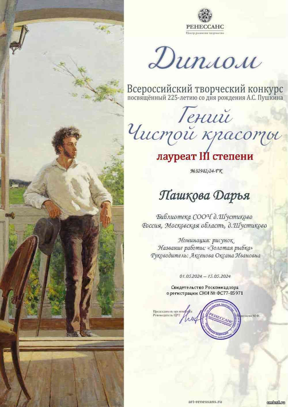 Читатели библиотеки д. Шустиково приняли участие во Всероссийском творческом онлайн-конкурсе рисунков «Гений чистой красоты» по произведениям А.С. Пушкина, приуроченном к 225-летию со дня рождения автора.