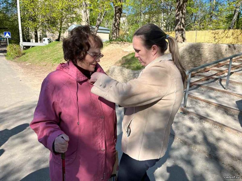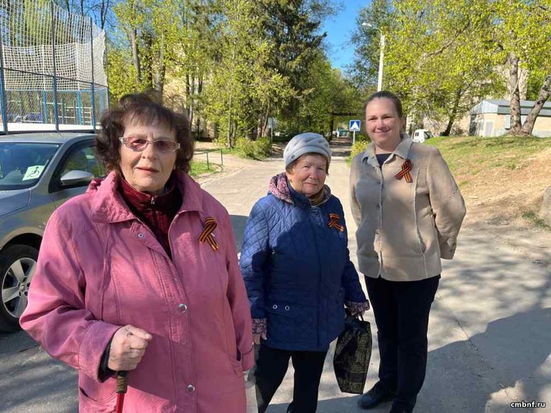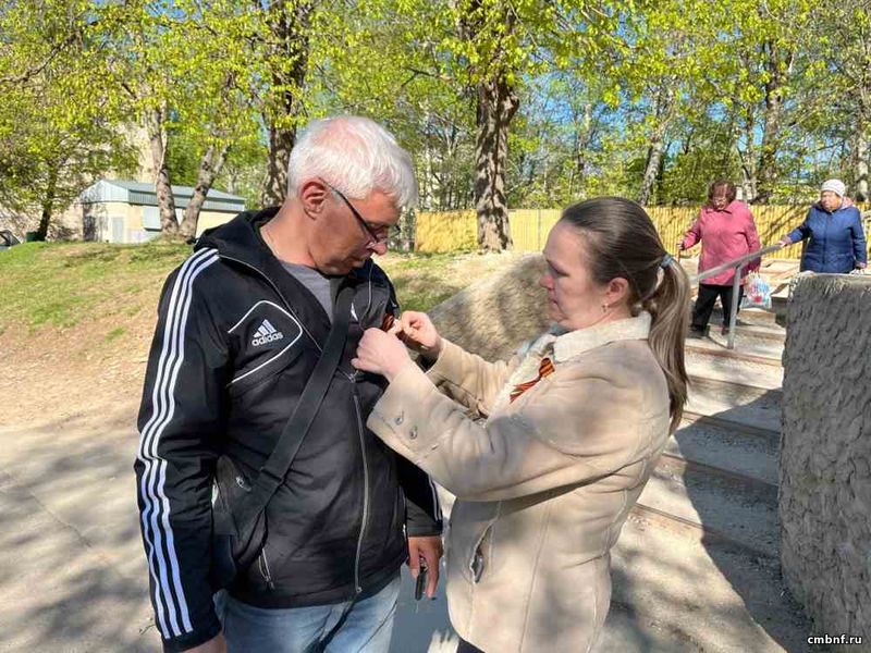 Библиотекарь Ольга Овчинникова раздавала прохожим ленточки, показывая, как правильно нужно их носить и рассказывая, что символизирует Георгиевская лента для россиян.