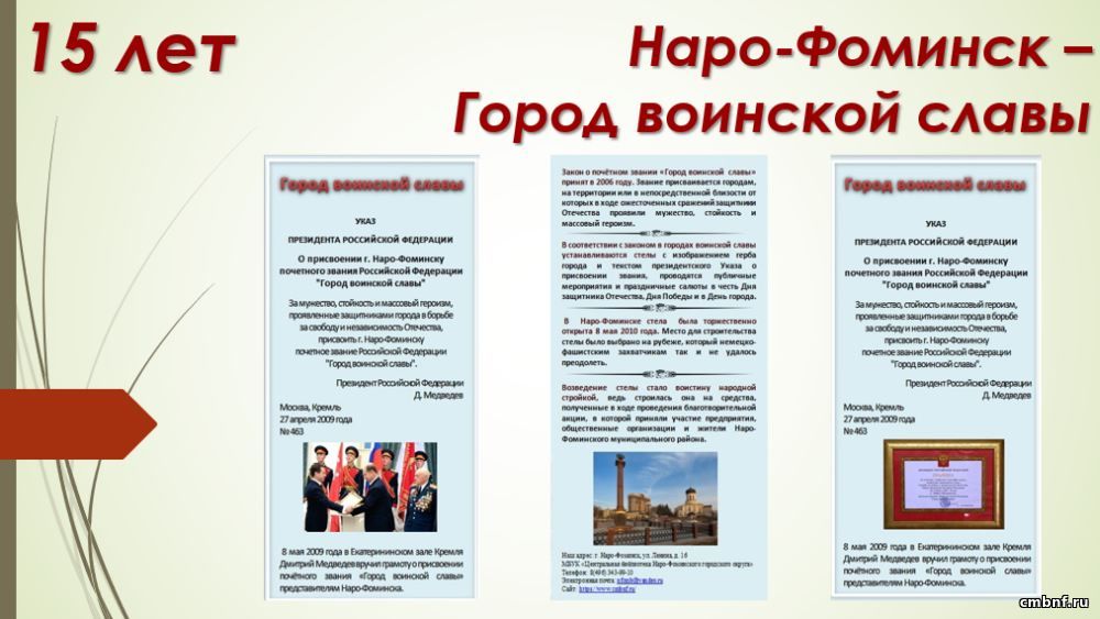27 апреля 2009 года Указом Президента Российской Федерации за мужество, стойкость и массовый героизм, проявленные защитниками города в борьбе за свободу и независимость Отечества, Наро-Фоминску присвоено почетное звание Российской Федерации "Город воинской славы". 8 мая в Екатерининском зале Кремля Дмитрий Медведев вручил грамоты о присвоении почётного звания «Город воинской славы» представителям Наро-Фоминска. Ровно через год, 8 мая 2010 года в городе Наро-Фоминске была торжественно открыта стела.