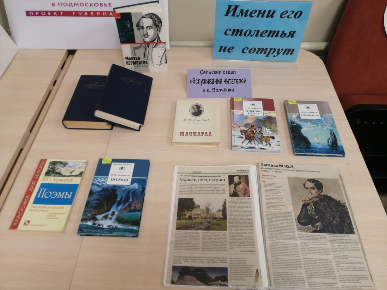 15 октября день рождения великого русского поэта Михаила Юрьевича Лермонтова. В честь этой даты библиотекарь сельского отдела обслуживания читателей д.Волчёнки Анастасия Тихонова в фойе детского сада разместила книжную выставку «Имени его столетья не сотрут…».