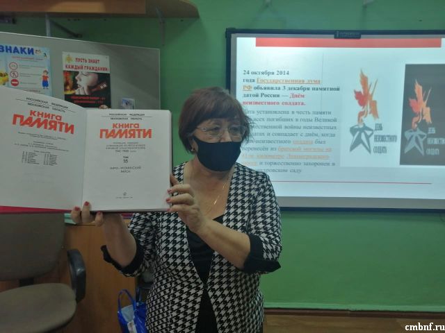 День Неизвестного солдата - памятная дата в России, с 2014 года отмечаемая 3 декабря в память о российских и советских воинах, не вернувшихся с полей сражений. Могила Неизвестного солдата у Кремлёвской стены в Москве - это святыня всего народа, наша вечная боль и наша вечная гордость. Библиотекарь отдела обслуживания читателей Ревина С.И. в рамках лектория «Отечество» 4 декабря провела час истории «Имя твоё - неизвестно. Подвиг твой - бессмертен!» со старшеклассниками Наро-Фоминской школы для обучающихся с ограниченными возможностями здоровья.