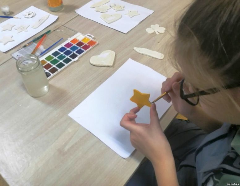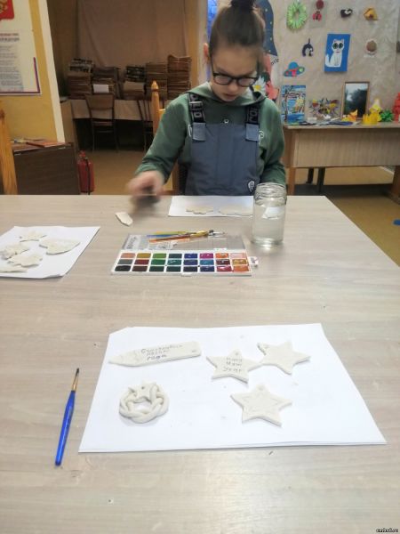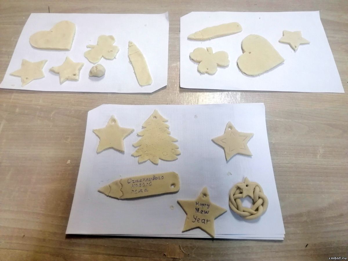 Итогом мероприятия стали не только новые знания, а так же создание своих новогодних елочных игрушек из теста, которое прошло в два этапа - лепка и раскраска.