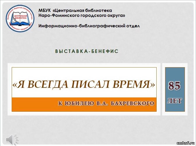 Сотрудники информационно-библиографического отдела подготовили к 85-летию писателя виртуальную выставку-бенефис «Я всегда писал время». Выставка расскажет о В.А. Бахревском как авторе исторических романов, познакомит с высказываниями писателя о своём творчестве и с отзывами читателей о произведениях Владислава Анатольевича.