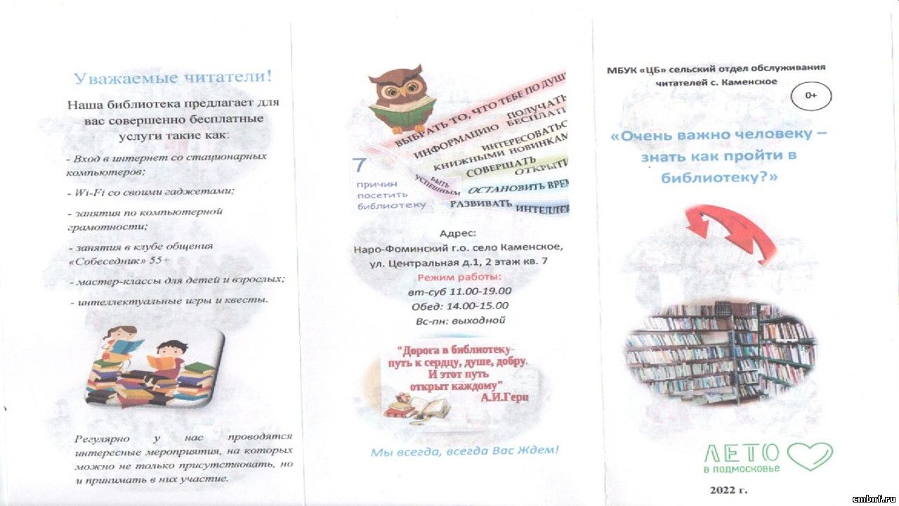 26 мая в сельском отделе обслуживания читателей с. Каменское была проведена акция «Как пройти в библиотеку». Всем желающим жителям раздавались буклеты, подготовленные библиотекарем Верой Семакиной, под названием «Очень важно человеку знать, как пройти в библиотеку».