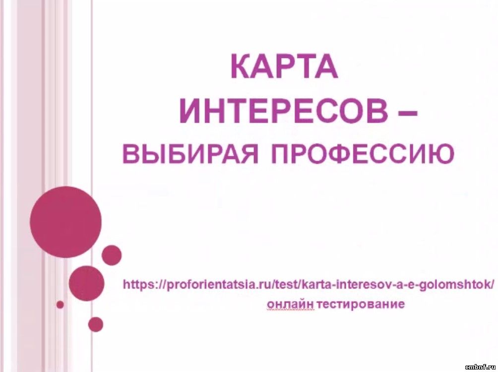 Библиотекарь Лариса Дмитриева (п.Атепцево) представляет презентацию «Карта интересов – выбирая профессию». В презентации представлена известная и популярная методика для выявления склонностей и интересов по 29 различным направлениям профессиональной деятельности. Знакомимся с «Картой интересов» от А.Е. Голомштока.