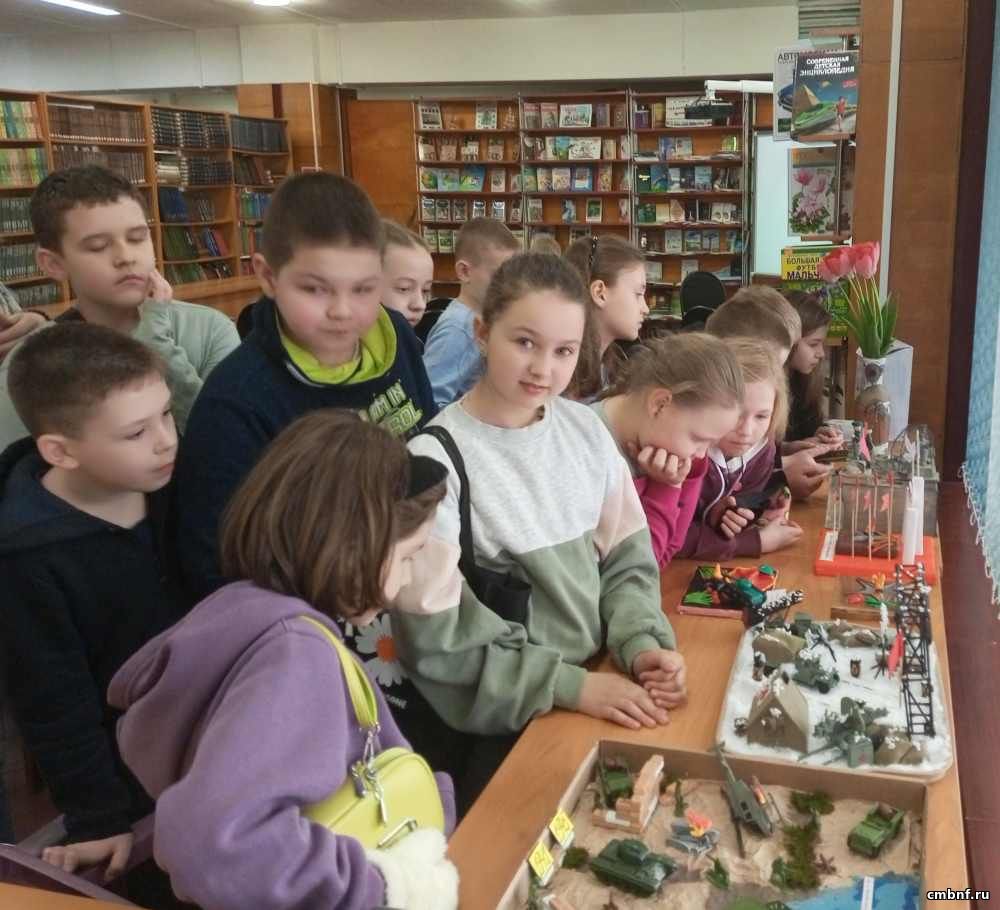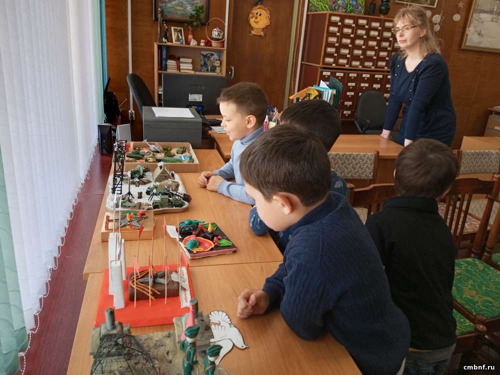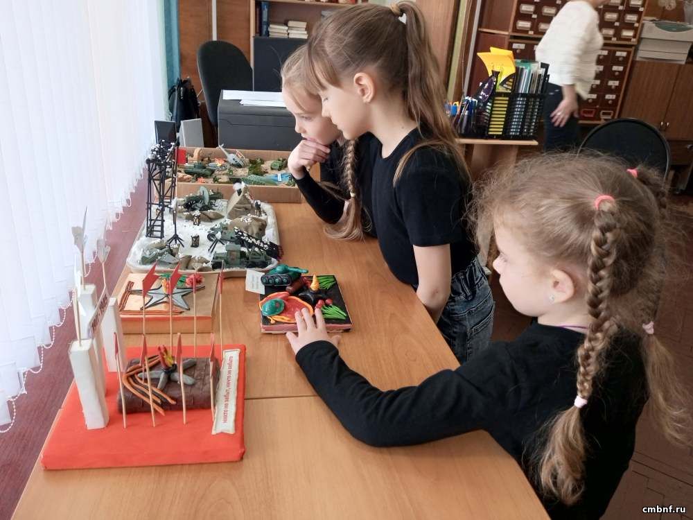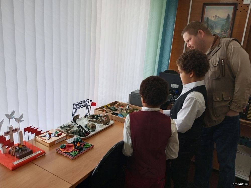 Сотрудниками отдела обслуживания читателей (ул. Маршала Жукова, д.10) была организована тематическая выставка творческих работ - совместного творения детей и родителей. На выставке были представлены инсталляции с боевой техникой времен Великой Отечественной войны, пушки, самолеты, а так же картины, выполненные из различных материалов – бумаги, пластилина, пластмассы.