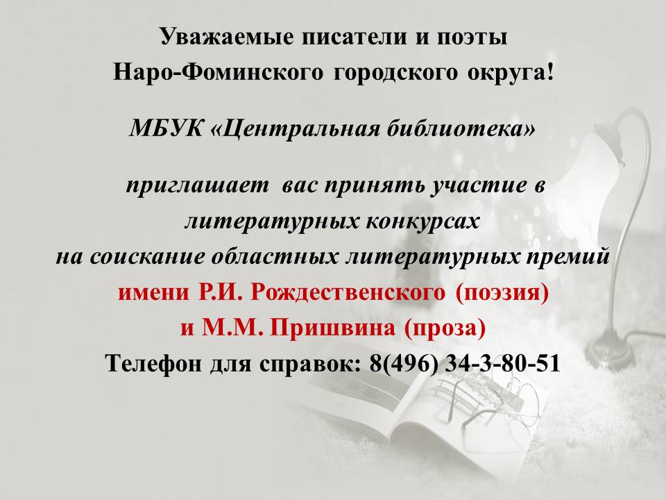 Уважаемые писатели и поэты Наро - Фоминского городского округа! МБУК "Центральная Библиотека" приглашает Вас принять участие в литературных конкурсах на соискание областных литературных премий имени Р. И. Рождественского (поэзия) и М. М. Пришвина (проза). Телефон для справок 8(496)34-3-80-51