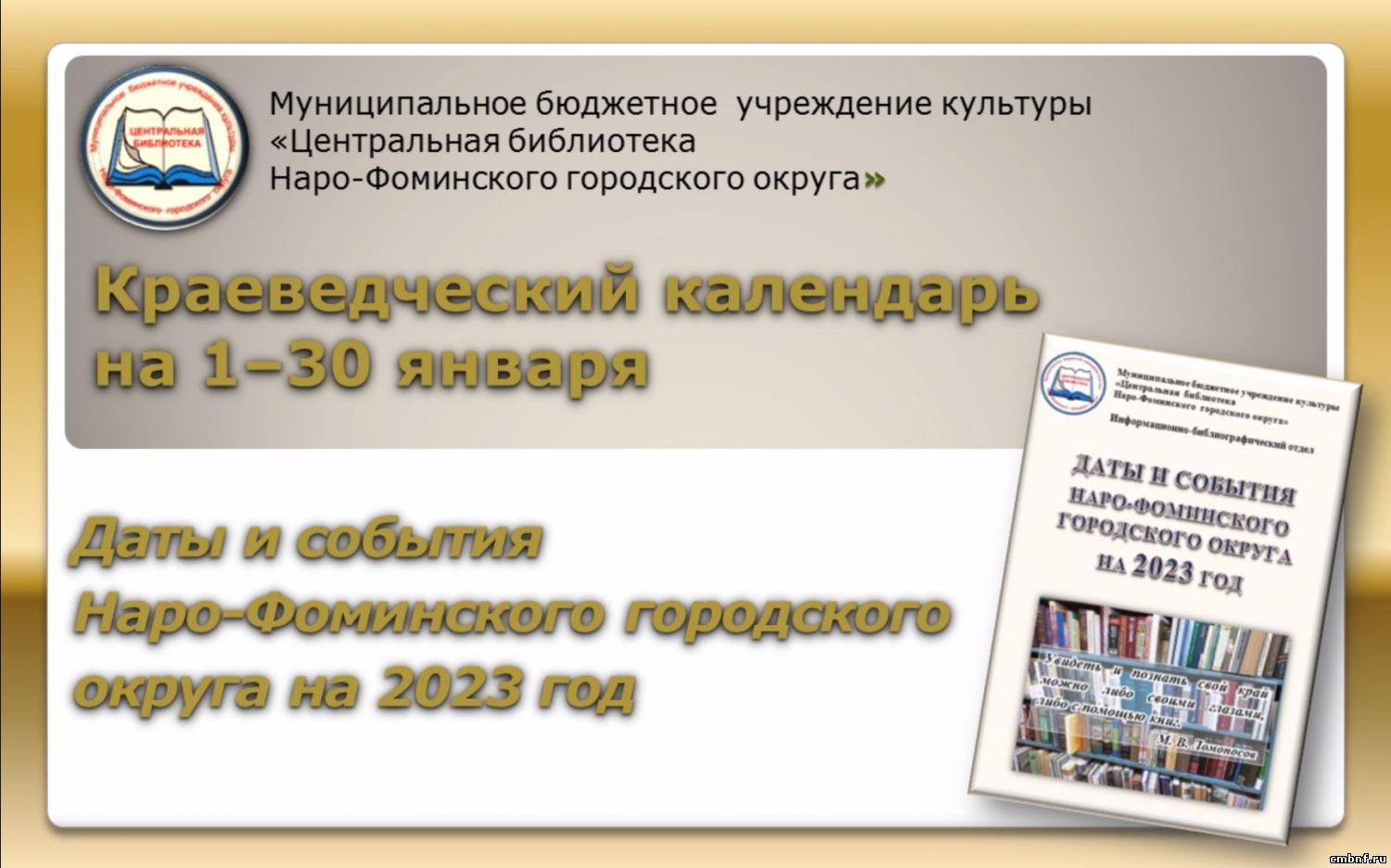 Знакомьтесь со знаменательными и памятными датами первого месяца нового 2023 года. Видеообзор по материалам календаря «Даты и события Наро-Фоминского городского округа на 2023 год» предлагает сотрудник информационно-библиографического отдела Елена Павлова. В календарь включены даты, выявленные по источникам, имеющимся в краеведческом фонде МБУК «ЦБ».