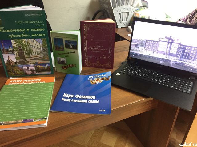 Очередная встреча библиотекарей отдела обслуживания читателей с посетителями литературной гостиной Наро-Фоминской районной общественной организации «Диабет» была посвящена 95-летию родного города. Библиотекарь С.Ревина рассказала присутствующим историю города, используя материалы книжной выставки, показала краеведческий документальный фильм, созданный заведующей отделом Г.А. Антоновой «Мой город - частица России».