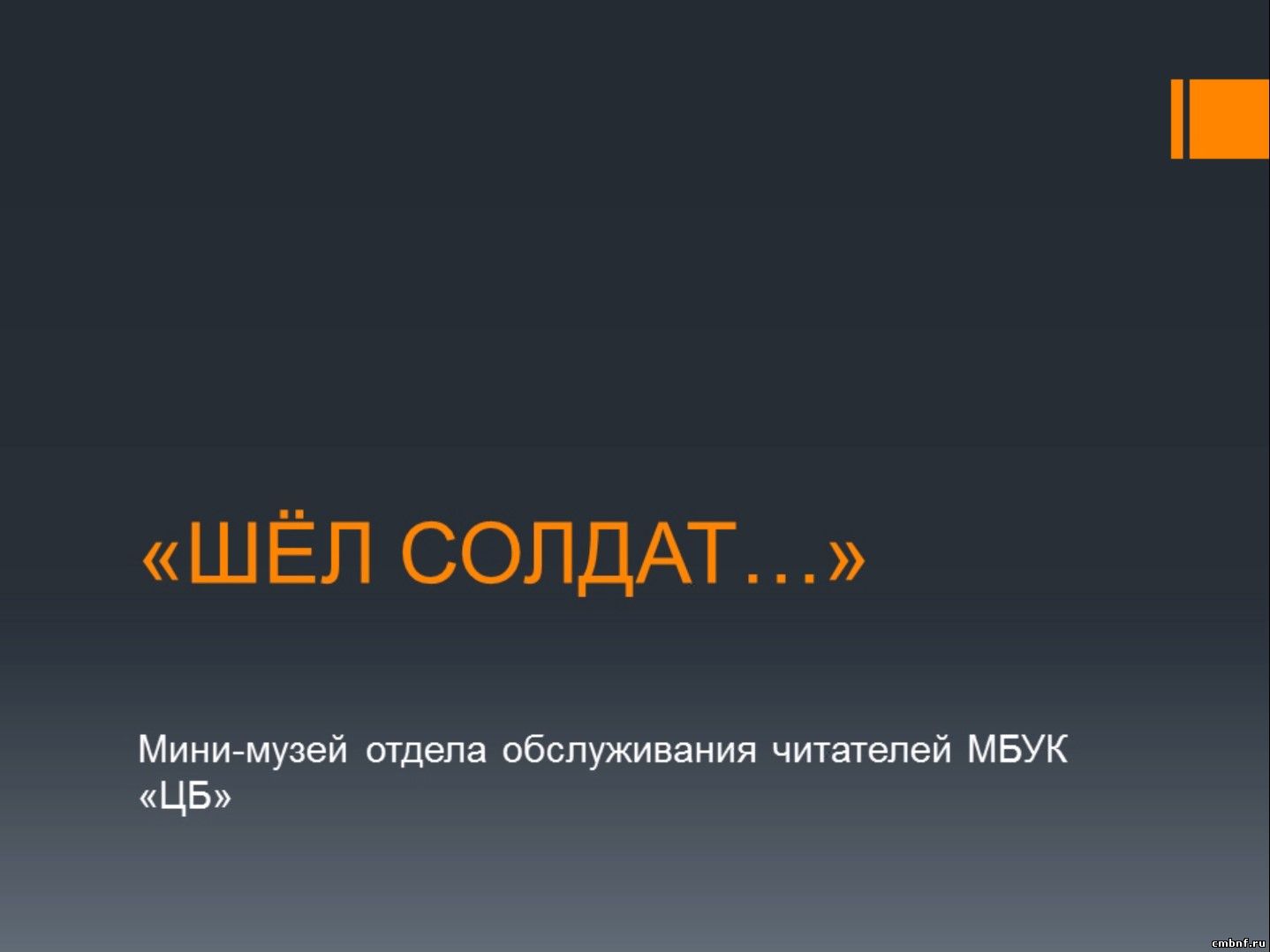 В мире существует большое множество разных видов музеев. Это и краеведческий, археологический, художественный, исторический, музей-заповедник и т.д. Мини-музей, расположенный в отделе обслуживания читателей МБУК «ЦБ» - военно-исторический. Экспозиция музея посвящена Великой Отечественной войне. Наличие этой экспозиции помогает сотрудникам библиотеки в работе по патриотическому направлению деятельности и, конечно, по краеведению. Предлагаем совершить онлайн - экскурсию в мини-музей библиотеки «Шёл солдат…».