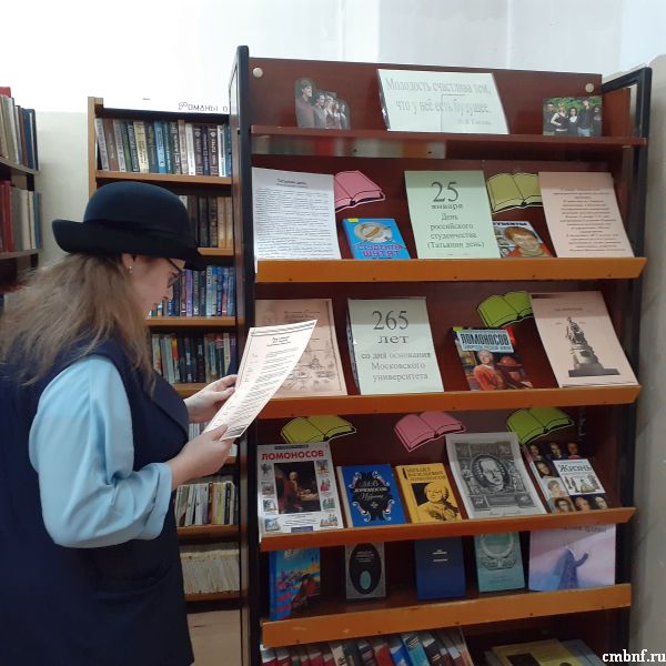 25 января в отделе обслуживания читателей (ул. Латышская, 15 Б) была организованна книжная выставка, посвященная Дню российского студенчества. 265 лет назад в этот день был подписан указ об учреждении Московского университета. На выставке представлены материалы об истории возникновения праздника, так же в беседе библиотекари рассказали про ту роль, которую сыграли М.В. Ломоносов и И.И. Шувалов в становлении и развитии Московского университета.