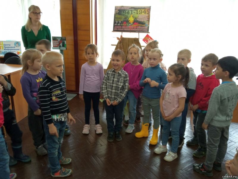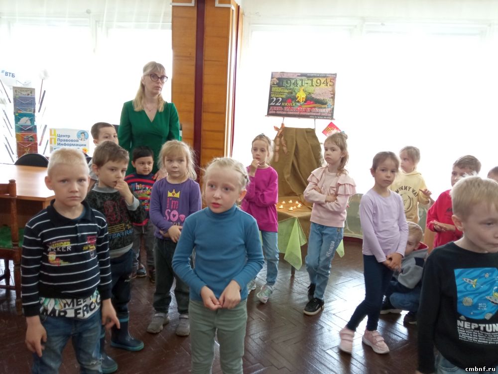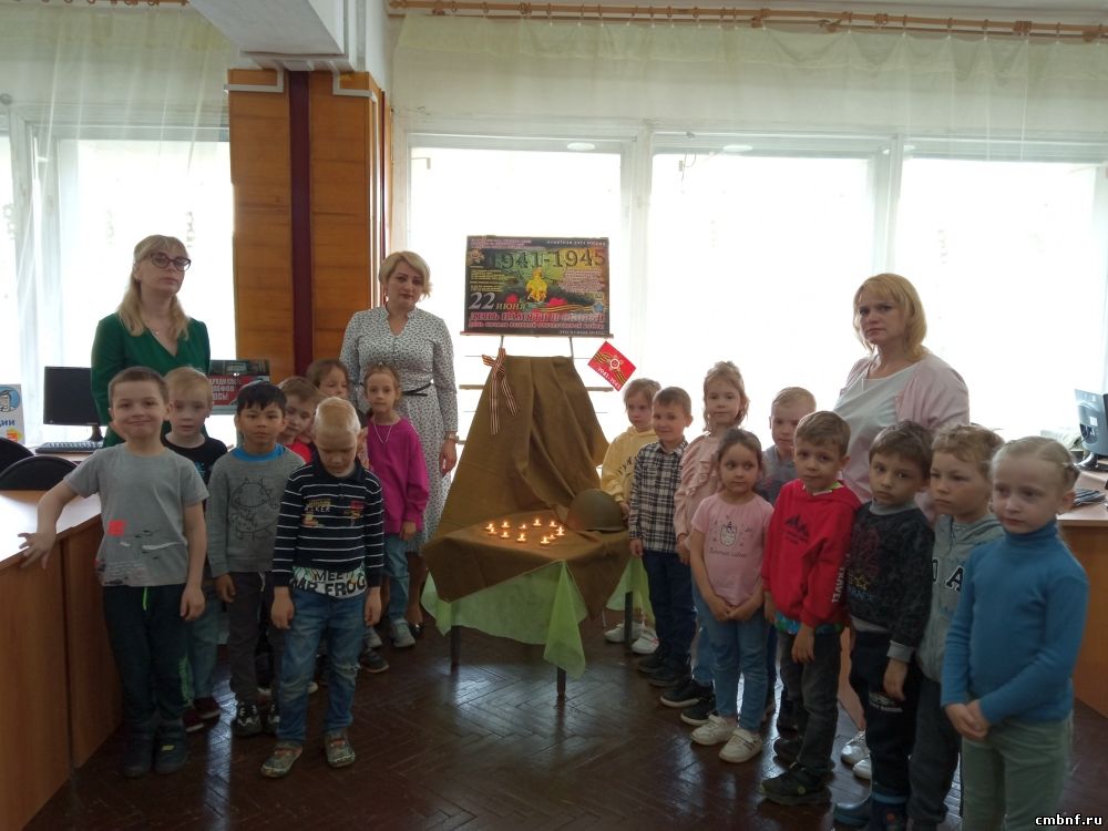 В отдел обслуживания читателей (ул. Маршала Жукова 10) пришли воспитатели детского сада № 7 со своими подопечными. Так как дети в библиотеке были впервые, для них была проведена небольшая ознакомительная экскурсия, а затем ребята приняли участие в акции «Свеча памяти». Заведующая отделом Нестеренко Л.А. рассказала о Великой Отечественной войне и о том, почему каждый год проводится акция «Зажги свечу памяти». Ребята с воспитателями зажгли свечи, почтили память погибших минутой молчания, а затем рассказали стихи, подготовленные к этому дню, и разукрасили картинку «Вечный огонь».