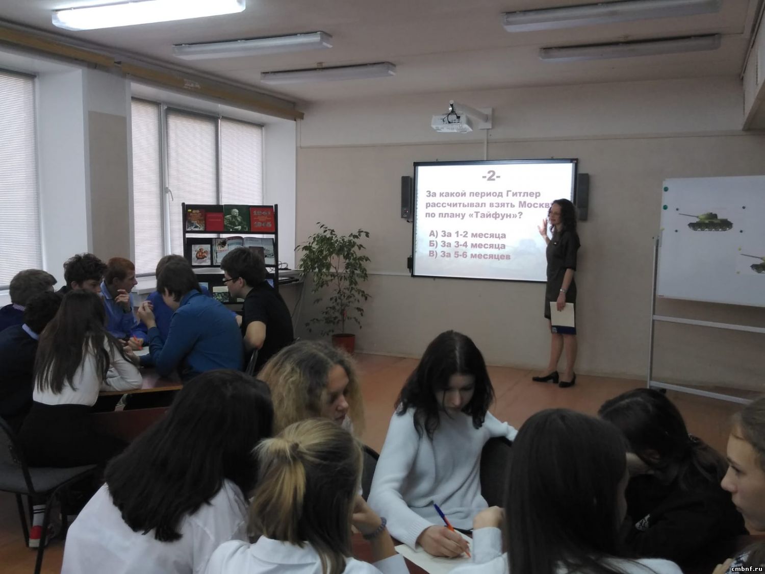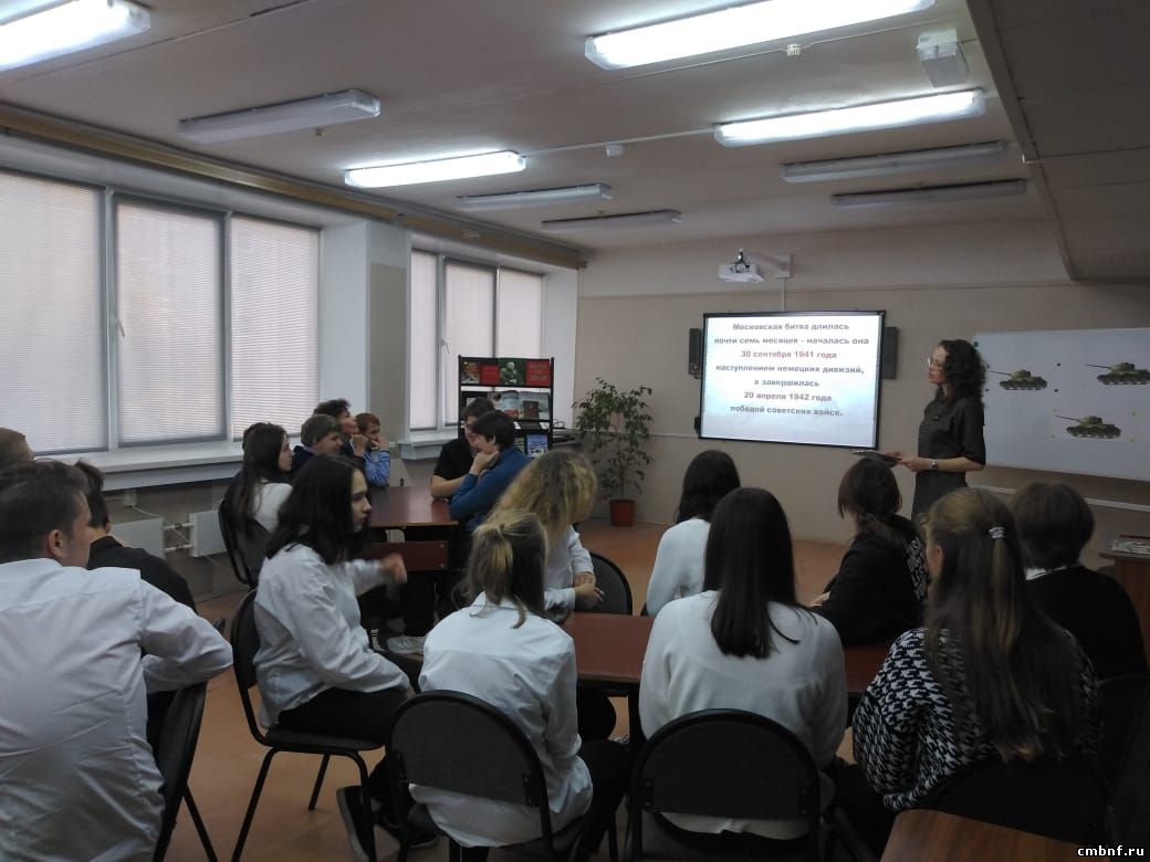 Одним из крупнейших сражений Великой Отечественной войны стала битва под Москвой. 30 сентября 1941 года немецкая группа армий «Центр» начала операцию «Тайфун» с целью овладеть советской столицей. В отделе обслуживания читателей (ул. Латышская, 15б) прошла военно-патриотическая игра для молодежи, посвященная этим событиям. Юных патриотов ожидали шифровки, «срочные депеши» и «секреты» печатной машинки. Им предстояло пройти блиц-опрос о Московской битве, угадать названия военных песен и плакатов. Проходя по заданному маршруту и выполняя задания, участники вспомнили события и героев сражения за столицу нашей Родины.
