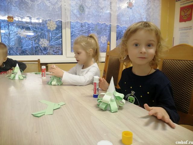 Участие в мастер-классе по созданию зеленого наряда для елочки приняли дети средней группы детского сада.